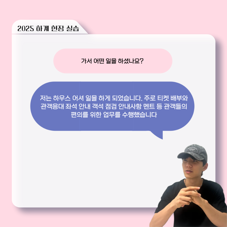 본문 시작 홈으로 커뮤니티 학과소개 입학정보 교수소개 학과과정 커뮤니티 공연예매 안내 홈페이지가이드 포토갤러리 공지사항 포토갤러리 작품DB 동아리 학사일정 학생회 포토갤러리 페이스북 트위터 프린트 ‘늘‘ 궁금한 이야기 - 현장실습 < 이종서 > 연기예술학과 1414 2025-09-17 . 목록 이전‘늘‘ 궁금한 이야기 - 젊은연극제 ‘20세기 소년소녀 창가집’ 다큐pd 役 < 임재완 > 이전117회 세명대학교 연기예술학과 하계프로젝트 사랑의온도 작품소개 담당부서 : 연기예술학과 담당자 : - 연락처 : 043-649-1733 최종수정일 : 2024-10-26 만족도조사 만족도 조사 이 페이지에서 제공하는 정보에 대하여 만족하시나요? 매우만족 만족 보통 불만족 매우불만족
