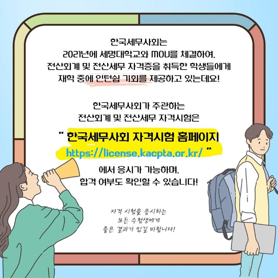 한국세무사회는 2021년에 세명대학교와 MOU를 체결하여, 전산회계 및 전산세무 자격증을 취득한 학생들에게 재학 중에 인턴쉽 기회를 제공하고 있습니다.