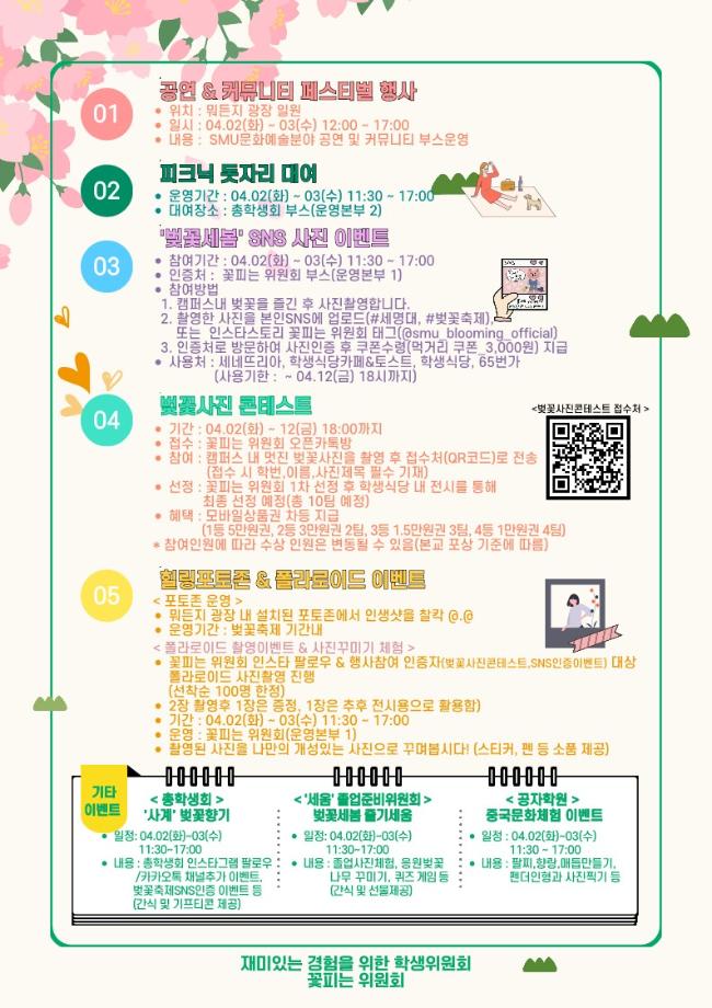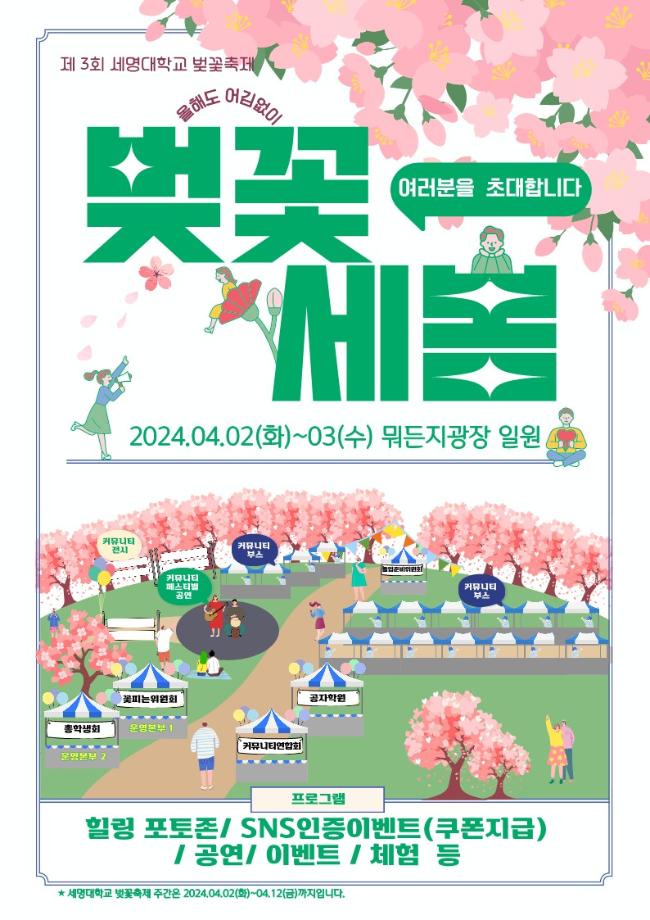 본문 시작 홈으로 학과소식 학과소개 취업정보 교육과정 학과소식 홈페이지가이드 포토갤러리 공지사항 포토갤러리 학과이야기 학과행사 포토갤러리 페이스북 트위터 프린트 🌸 제3회 벚꽃세봄 🌸 회계세무학과 1768 2024-03-29 🌸 올해도 어김없이, 제3회 벚꽃세봄 🌸 제3회 세명대학교 벚꽃축제, 벚꽃세봄에 여러분을 초대합니다! 힐링 포토존, SNS 인증 이벤트, 공연 등 다양한 프로그램과 함께 세명대학교의 벚꽃을 즐겨요🥰 💌 일자: 4월 2일(화) ~ 3일(수) 💌 장소: 뭐든지광장 일원 목록 이전제9회 커뮤니티 페스티벌 다음 [Book 콘서트] '김선태 (충TV)' Book 콘서트에 초대합니다. 담당부서 : 회계세무학과 담당자 : - 연락처 : 043-649-1244 최종수정일 : 2024-10-26 만족도조사 만족도 조사 이 페이지에서 제공하는 정보에 대하여 만족하시나요? 매우만족 만족 보통 불만족 매우불만족