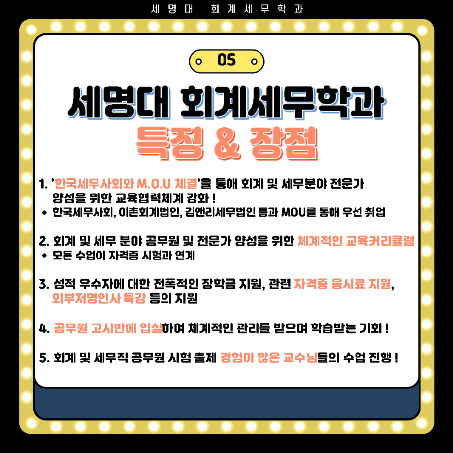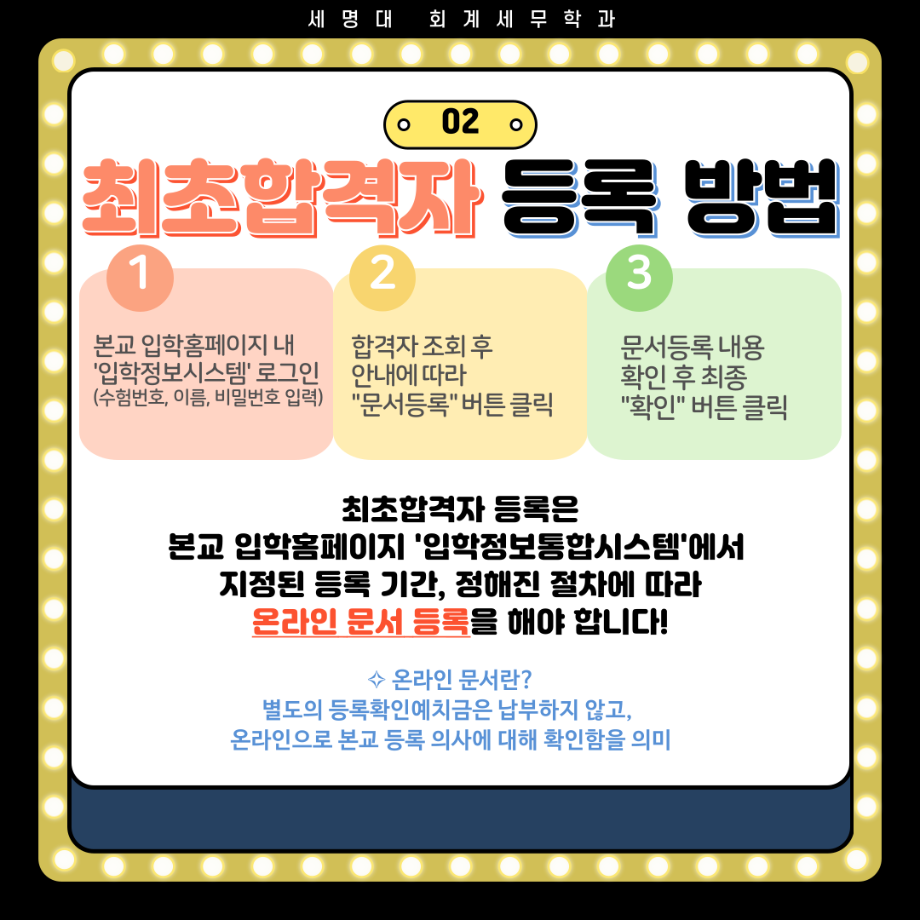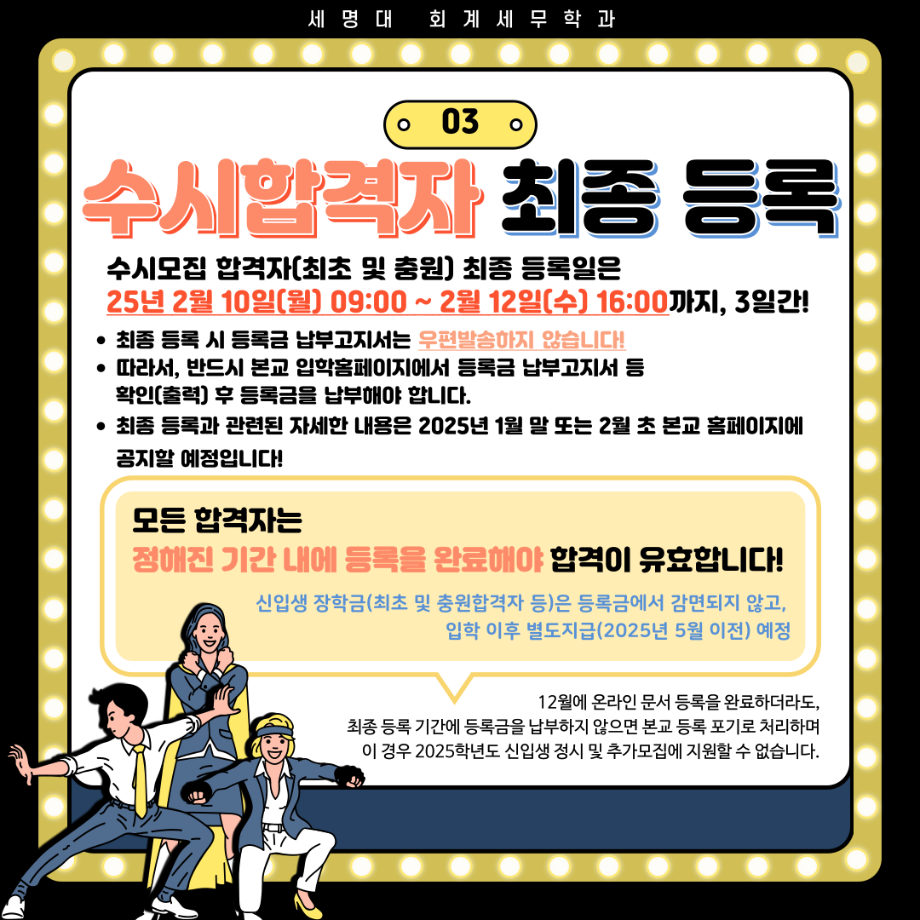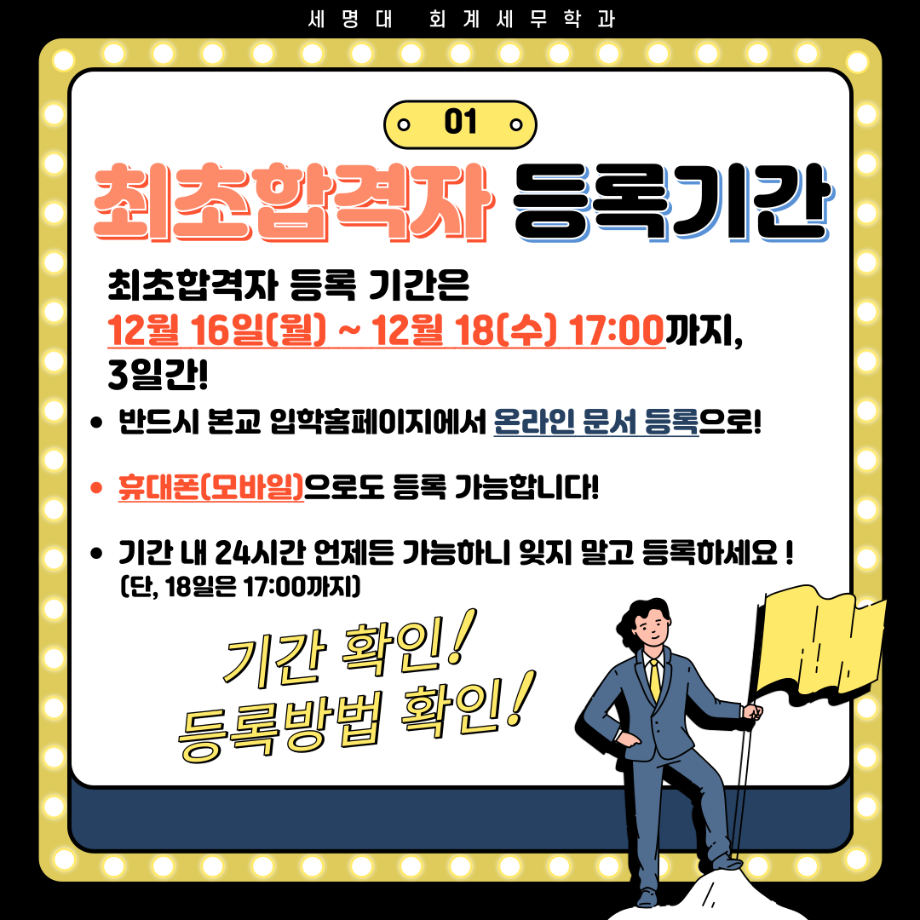 본문 시작 홈으로 학과소식 학과소개 취업정보 교육과정 학과소식 홈페이지가이드 포토갤러리 공지사항 포토갤러리 학과이야기 학과행사 포토갤러리 페이스북 트위터 프린트 2025학년도 수시모집 최초합격자 등록 안내 회계세무학과 1682 2024-12-16 2025 학년도 수시모집 최초합격자 등록 안내사항입니다. 목록 이전12월 학사일정 다음 [알쓸신잡_2025년 01월 3주차] ●취업 및 일자리 정보 제공 안내문● 담당부서 : 회계세무학과 담당자 : - 연락처 : 043-649-1244 최종수정일 : 2024-10-26 만족도조사 만족도 조사 이 페이지에서 제공하는 정보에 대하여 만족하시나요? 매우만족 만족 보통 불만족 매우불만족