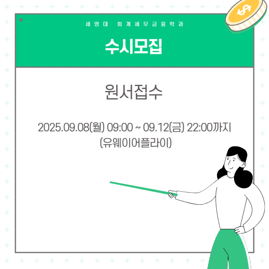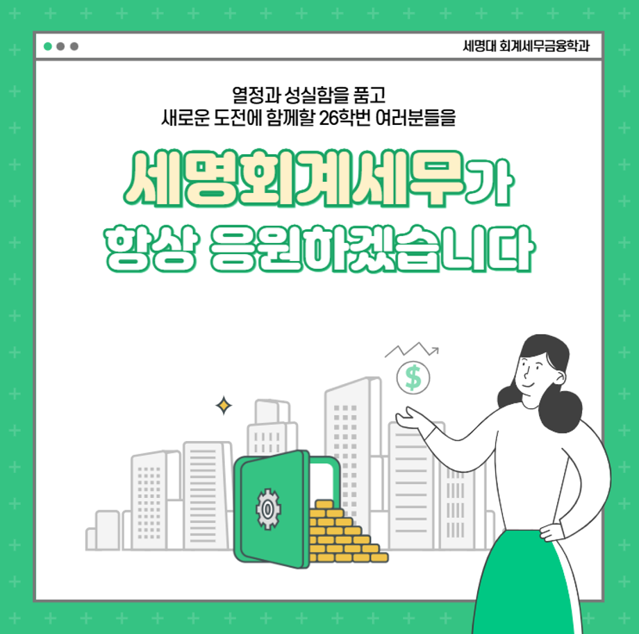 본문 시작 홈으로 학과소식 학과소개 취업정보 교육과정 학과소식 홈페이지가이드 포토갤러리 공지사항 포토갤러리 학과이야기 학과행사 포토갤러리 페이스북 트위터 프린트 💙2026학년도 회계세무금융학과 신입생모집 카드뉴스💙 회계세무금융학과 601 2025-09-09 2026학년도 회계세무금융학과 신입생모집 카드뉴스 목록 이전9월 학사일정 다음 💙세명대 회계세무금융학과 진로 로드맵💙 담당부서 : 회계세무학과 담당자 : - 연락처 : 043-649-1244 최종수정일 : 2024-10-26 만족도조사 만족도 조사 이 페이지에서 제공하는 정보에 대하여 만족하시나요? 매우만족 만족 보통 불만족 매우불만족