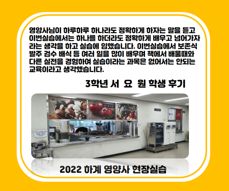 본문 시작 홈으로 커뮤니티 학부소개 진로·취업 교육과정 커뮤니티 대학원 입학상담 홈페이지가이드 갤러리 공지사항 갤러리 학생회 동문회 전공자료실 전공동아리 Youtube Instagram 갤러리 페이스북 트위터 프린트 2022 하계영양사 현장실습(목원푸드 코레일 승무원기숙식당) 바이오식품영양학부 2091 2022-07-18 목록 이전2022 하계영양사 현장실습(동일여자고등학교) 다음 2022 하계영양사 현장실습(제천어린이급식지원센터) 담당부서 : 바이오식품영양학부 담당자 : - 연락처 : 043-649-1430 최종수정일 : 2024-10-26 만족도조사 만족도 조사 이 페이지에서 제공하는 정보에 대하여 만족하시나요? 매우만족 만족 보통 불만족 매우불만족