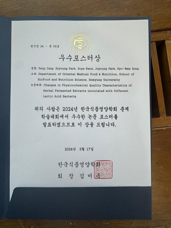지난 17일 한양대학교에서 개최된 '한국식품학회 춘계학술대회'에서 건강기능식품개발연구소(송효남교수님 지도) 소속 학생들 중 대학원생 정엽, 학석사 박소영, 학부생 권도예, 박주영 학생이 학술 연구 발표 후 우수 포스터상을 수상하였습니다. 축하합니다!