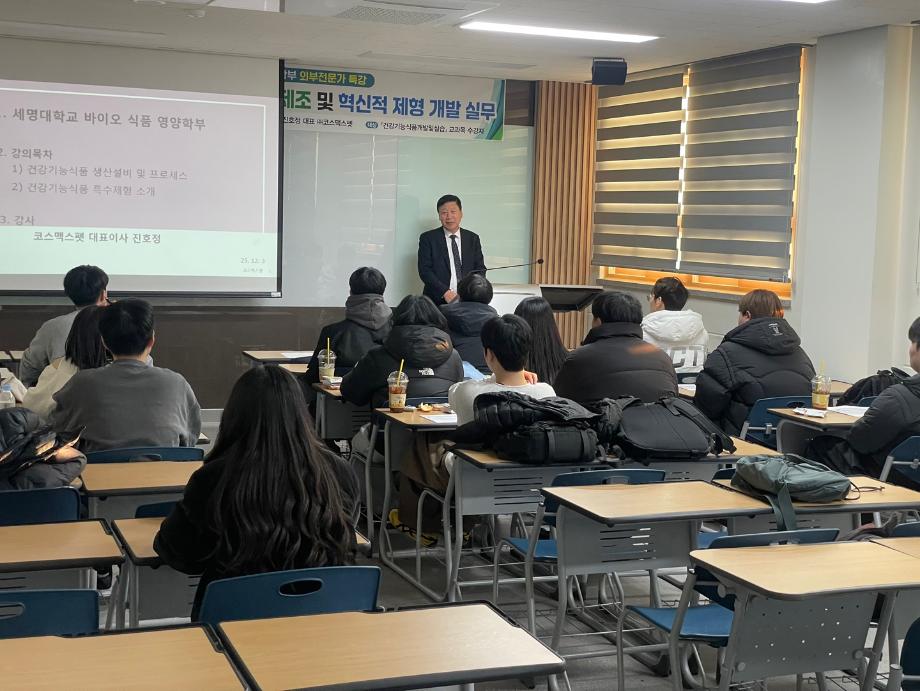 본문 시작 홈으로 커뮤니티 학부소개 진로·취업 교육과정 커뮤니티 대학원 입학상담 홈페이지가이드 갤러리 공지사항 갤러리 학생회 동문회 전공자료실 전공동아리 Youtube Instagram 갤러리 페이스북 트위터 프린트 실무체험 외부전문가 특강: 진호정 대표(코스맥스펫) 바이오식품영양학부 939 2025-12-04 실무체험교과목 "건강기능식품개발및실습" 특강 1) 강사: 진호정 대표(코스맥스펫) 2) 주제: '산업 현장에서의 건강기능식품 제조 및 혁신적 제형 개발 실무' 3) 일시 및 장소: 12월 3일, 바이오학관302호 *특강을 통해 현장 실무과 취업 및 연구동향에 대해 자세히 강의해 주신 진호정 대표님께 감사드립니다. 목록 이전2025 자기설계 해외배낭연수(7/8~7/15, 호주) 다음 [교과목안내] AI기반식품QAQC 담당부서 : 바이오식품영양학부 담당자 : - 연락처 : 043-649-1430 최종수정일 : 2024-10-26 만족도조사 만족도 조사 이 페이지에서 제공하는 정보에 대하여 만족하시나요? 매우만족 만족 보통 불만족 매우불만족