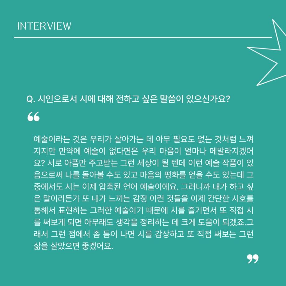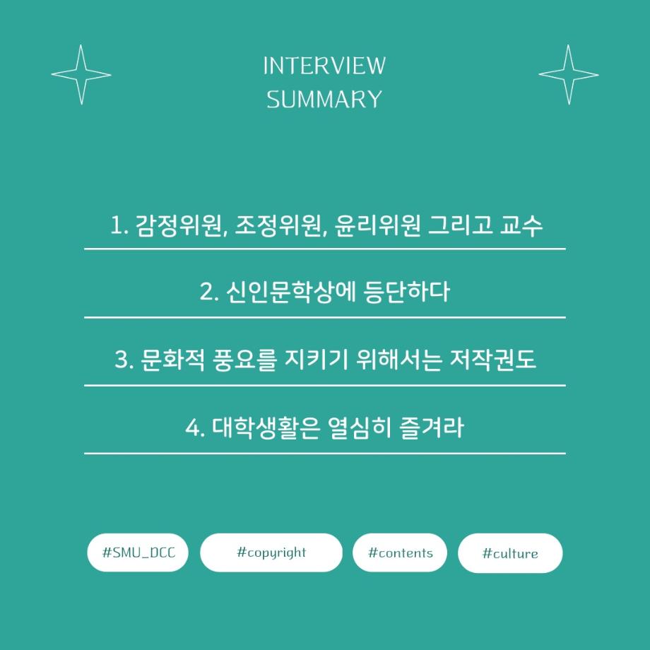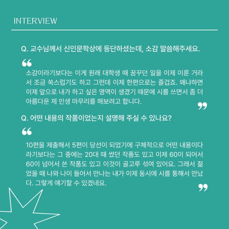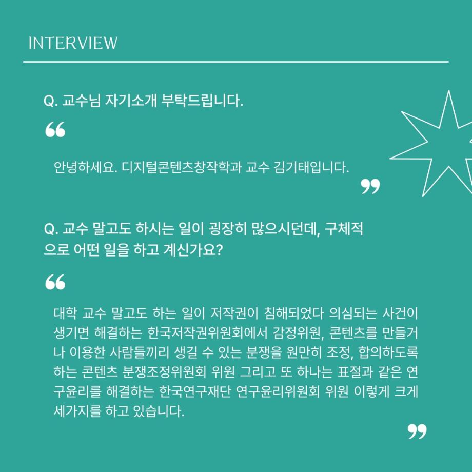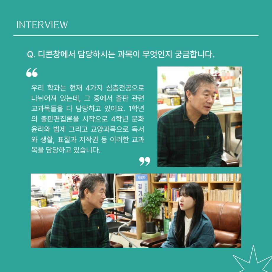 본문 시작 홈으로 MCC News 학과소개 교수소개 학과과정 MCC News MCC SNS 홈페이지가이드 교수 및 졸업생 학과 및 재학생 교수 및 졸업생 미디어 정보통 교수 및 졸업생 페이스북 트위터 프린트 디지털콘텐츠창작학과 김기태 교수님 인터뷰 📸 디지털콘텐츠창작학과 2459 2024-04-24 한국 저작권에서 빼놓을 수 없는 인물이자 중견 문예지 ‘계간 시현실’에 2024 신인문학상에 당선되어 신인 시인이 되신 김기태 교수님을 모시고 인터뷰했습니다. 다양한 활동을 해오신 김기태 교수님의 한 말씀 우리 함께 들어봐요! 목록 이전디지털콘텐츠창작학과 권화숙 교수님 인터뷰 📸 다음 📚디지털콘텐츠창작학과 권화숙 교수님 저자 동화책 소개📚 담당부서 : 미디어콘텐츠창작학과 담당자 : - 연락처 : 043-649-1741 최종수정일 : 2024-10-26 만족도조사 만족도 조사 이 페이지에서 제공하는 정보에 대하여 만족하시나요? 매우만족 만족 보통 불만족 매우불만족