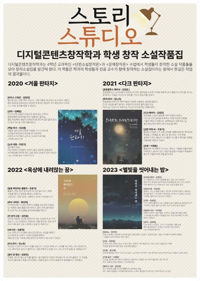 본문 시작 홈으로 MCC News 학과소개 교수소개 학과과정 MCC News MCC SNS 홈페이지가이드 교수 및 졸업생 학과 및 재학생 교수 및 졸업생 미디어 정보통 교수 및 졸업생 페이스북 트위터 프린트 디지털콘텐츠창작학과 학생 창작 소설작품집 디지털콘텐츠창작학과 2633 2024-05-16 디지털콘텐츠창작학과는 4학년 교과목인 <단편소설창작론>과 <문예창작론> 수업에서 학생들이 창작한 소설 작품들을 모아 창작소설집을 발간해왔습니다. 이 책들은 학과의 학생들과 전공 교수가 함께 창작하는 소설집이라는 첨에서 뜻깊은 작업의 결과물입니다. 2020<겨울 판타지> 2021<다크 판타지> 2022<옥상에 내려앉는 꿈> 2023<별빛을 씻어내는 밤> 이렇게 총 4권의 책들이 있는데요 4권 모두 훌륭한 작품성을 띠고있으니 한 번씩 읽어보시는 것 어떨까요? 목록 이전📚디지털콘텐츠창작학과 권화숙 교수님 저자 동화책 소개📚 다음 권화숙 교수님의 5월 신간 소개 담당부서 : 미디어콘텐츠창작학과 담당자 : - 연락처 : 043-649-1741 최종수정일 : 2024-10-26 만족도조사 만족도 조사 이 페이지에서 제공하는 정보에 대하여 만족하시나요? 매우만족 만족 보통 불만족 매우불만족