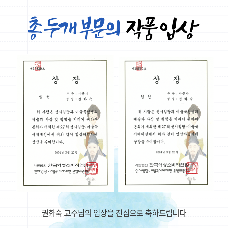 본문 시작 홈으로 MCC News 학과소개 교수소개 학과과정 MCC News MCC SNS 홈페이지가이드 교수 및 졸업생 학과 및 재학생 교수 및 졸업생 미디어 정보통 교수 및 졸업생 페이스북 트위터 프린트 🎊권화숙 교수님의 제27회 신사임당 이율곡 서예대전 입선🎊 디지털콘텐츠창작학과 2625 2024-08-19 디지털콘텐츠창작학과 권화숙 교수님께서제27회 신사임당 이율곡 서예대전에서 입상하셨습니다! 권화숙 교수님께서 지난 3월에 개최된 서예대전에서 입상하셨는데요, 총 두 개의 아름다운 솜씨가 돋보이는 작품으로 당당하게 입선하셨습니다! 진심으로 축하드립니다! 목록 이전권화숙 교수님의 5월 신간 소개 다음 권화숙 교수님의 동시집 '음식 말놀이'를 소개합니다! 담당부서 : 미디어콘텐츠창작학과 담당자 : - 연락처 : 043-649-1741 최종수정일 : 2024-10-26 만족도조사 만족도 조사 이 페이지에서 제공하는 정보에 대하여 만족하시나요? 매우만족 만족 보통 불만족 매우불만족