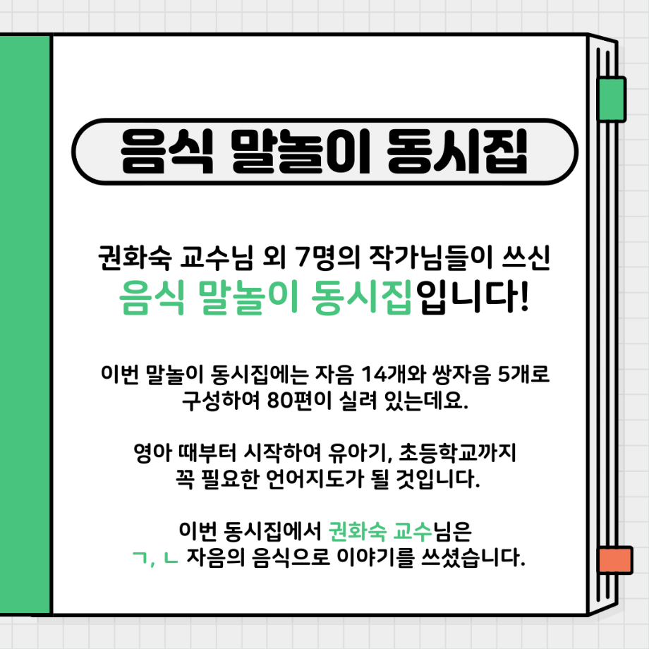 본문 시작 홈으로 MCC News 학과소개 교수소개 학과과정 MCC News MCC SNS 홈페이지가이드 교수 및 졸업생 학과 및 재학생 교수 및 졸업생 미디어 정보통 교수 및 졸업생 페이스북 트위터 프린트 권화숙 교수님의 동시집 '음식 말놀이'를 소개합니다! 디지털콘텐츠창작학과 2649 2024-08-22 이번 동시집은 권화숙 교수님 외 7명의 작가님들이 집필을 하셨습니다. 영아 때부터 시작하여 유아기, 초등학교까지 꼭 필요한 언어지도 책으로서 자음 14개와 쌍자음 5개로 구성하여 80편이 실려 있습니다!이 동시집을 읽다 보면 먹고 싶은 것이 자꾸 생각이 나 점심 메뉴는 어떤 것이 될까 궁금해지네요. 학우 여러분들의 많은 관심과 사랑 부탁드립니다! 목록 이전🎊권화숙 교수님의 제27회 신사임당 이율곡 서예대전 입선🎊 다음 🗣16학번 선배님의 현장 노하우🗣 담당부서 : 미디어콘텐츠창작학과 담당자 : - 연락처 : 043-649-1741 최종수정일 : 2024-10-26 만족도조사 만족도 조사 이 페이지에서 제공하는 정보에 대하여 만족하시나요? 매우만족 만족 보통 불만족 매우불만족