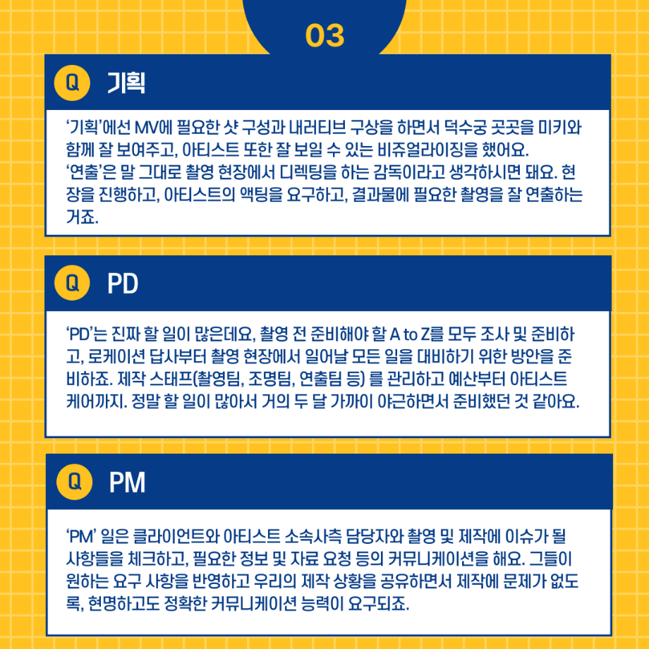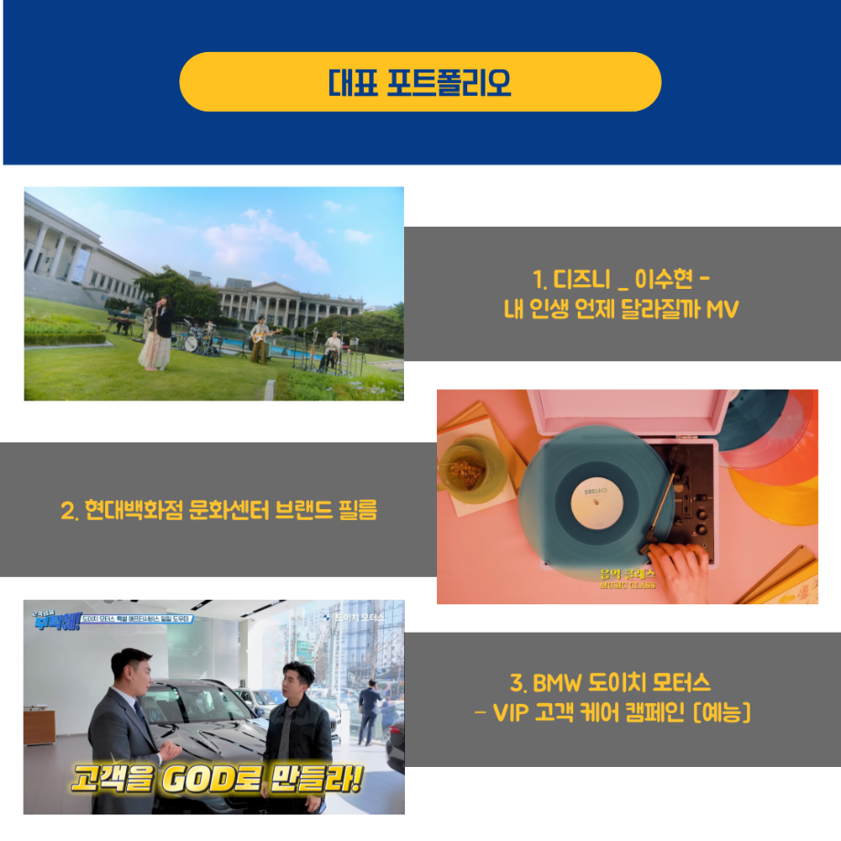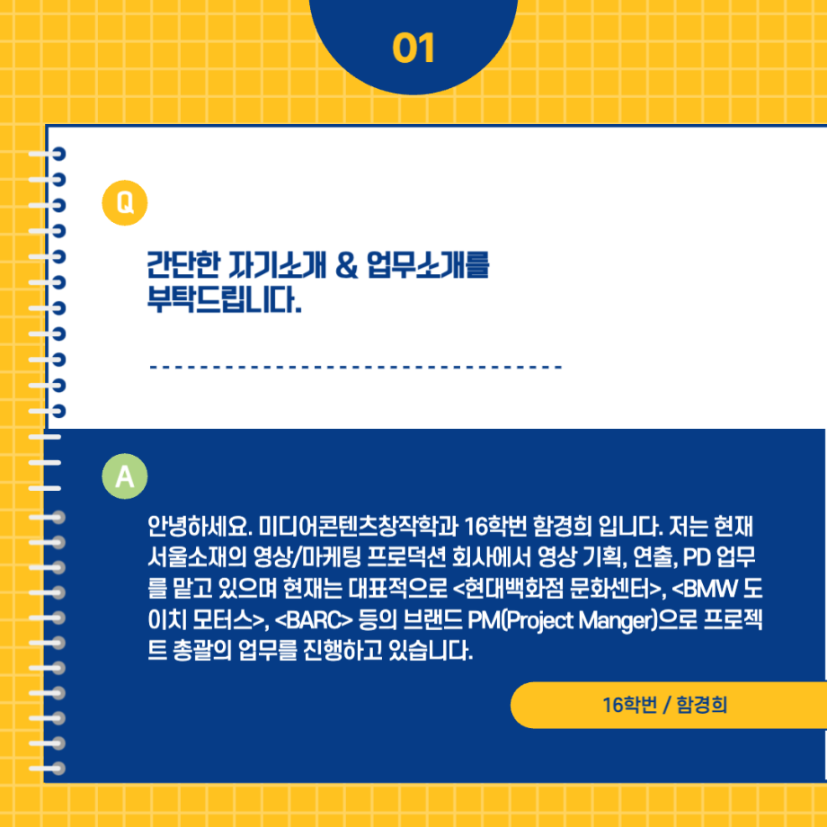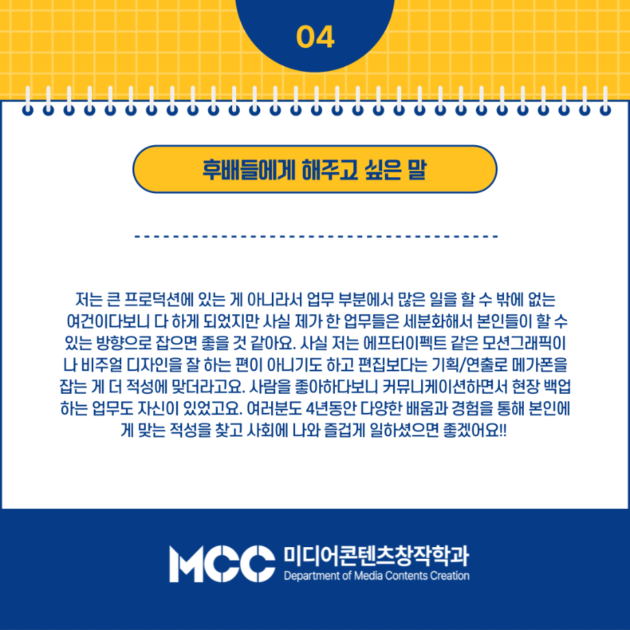 본문 시작 홈으로 MCC News 학과소개 교수소개 학과과정 MCC News MCC SNS 홈페이지가이드 교수 및 졸업생 학과 및 재학생 교수 및 졸업생 미디어 정보통 교수 및 졸업생 페이스북 트위터 프린트 🗣16학번 선배님의 현장 노하우🗣 미디어콘텐츠창작학과 3764 2024-10-24 오늘은 미디어콘텐츠창작학과를 졸업하신 16학번 함경희 선배님의 인터뷰를 진행했습니다 선배님이 현장에서 얻은 노하우와 소중한 경험들을 인터뷰를 통해 확인해보세요! 목록 이전권화숙 교수님의 동시집 '음식 말놀이'를 소개합니다! 다음 세명대 김기태 교수와 ㈜인포 박재원 대표, 10년째 장학금 기탁 담당부서 : 미디어콘텐츠창작학과 담당자 : - 연락처 : 043-649-1741 최종수정일 : 2024-10-26 만족도조사 만족도 조사 이 페이지에서 제공하는 정보에 대하여 만족하시나요? 매우만족 만족 보통 불만족 매우불만족