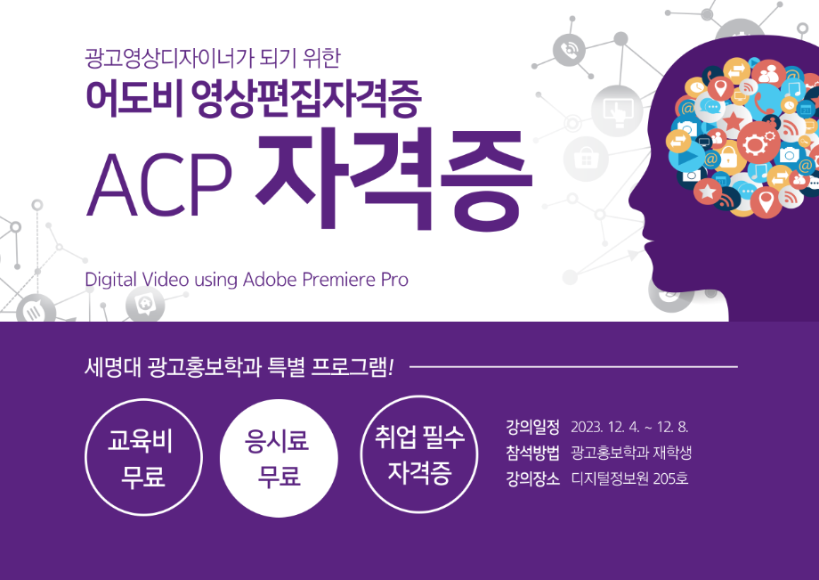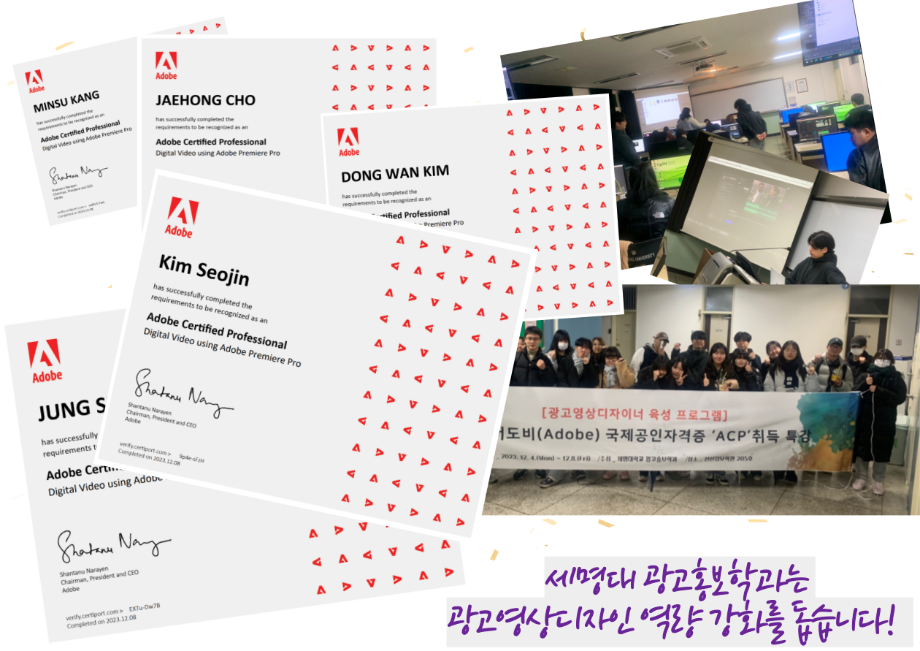 본문 시작 홈으로 특별CC프로그램 매력적인 학과소개 흥미로운 교육과정 특별CC프로그램 We can 취업 따뜻한 커뮤니티 홈페이지가이드 광고디자인 자격증취득 광고영상 제작실습 광고디자인 자격증취득 C&E(도전!경험!) 광고디자인 자격증취득 페이스북 트위터 프린트 [경축]광고영상제작편집 자격증 전원 취득 광고홍보학과 1912 2024-01-04 광고홍보학과에서 지원하는 광고영상디자인 역량 강화 프로그램 어도비( Adobe) 국제 공인 자격증 ACP 전원 취득을 축하합니다! 목록 이전Adobe Premier Pro 자격증 취득 다음 Adobe 포토샵 자격증 전원 합격