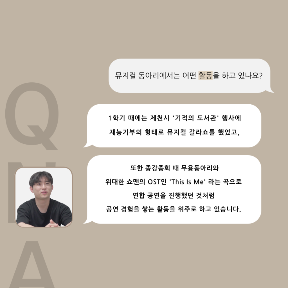 본문 시작 홈으로 커뮤니티 학과소개 입학정보 교수소개 학과과정 커뮤니티 공연예매 안내 홈페이지가이드 동아리 공지사항 포토갤러리 작품DB 동아리 학사일정 학생회 뮤지컬 동아리 무용 동아리 뮤지컬 동아리 극장 스탭 동아리 배우 훈련 동아리 뮤지컬 동아리 페이스북 트위터 프린트 '품'위있는 인’터뷰‘ - 24년도 뮤지컬동아리장 <정찬홍> 연기예술학과 2916 2024-07-31 안녕하십니까. 24년도 학회 ‘품‘ 입니다. 학회 ‘품’의 여덟 번째 인터뷰로 세명대학교 연기예술학과 24학년도 뮤지컬동아리장인 정찬홍 학우와 인터뷰 하는 시간을 가졌습니다. 뮤지컬 동아리장이 된 계기와 동아리에서는 어떤 활동을 하고있는지, 앞으로의 계획은 무엇으며 동아리 부원들에게 전하고 싶은 말 등을 질문하는 시간을 가졌습니다. 앞으로 있을 인터뷰 컨텐츠인 ‘품터뷰’ 많은 사랑 부탁드립니다. 목록 이전🎼 뮤지컬 동아리 “기적의 도서관” 갈라쇼 다음 2024학년도 2학기 뮤지컬 동아리 '음악;音樂' 활동 만족도조사 만족도 조사 이 페이지에서 제공하는 정보에 대하여 만족하시나요? 매우만족 만족 보통 불만족 매우불만족