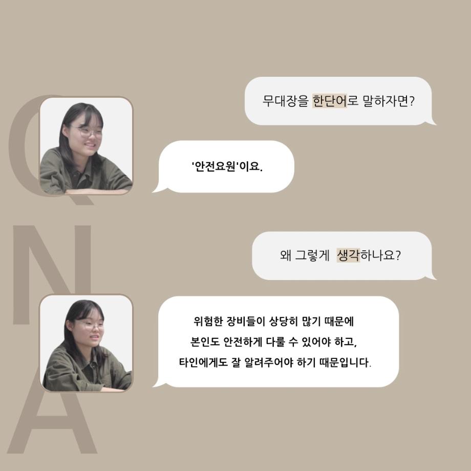 본문 시작 홈으로 커뮤니티 학과소개 입학정보 교수소개 학과과정 커뮤니티 공연예매 안내 홈페이지가이드 동아리 공지사항 포토갤러리 작품DB 동아리 학사일정 학생회 극장 스탭 동아리 무용 동아리 뮤지컬 동아리 극장 스탭 동아리 배우 훈련 동아리 극장 스탭 동아리 페이스북 트위터 프린트 ’품‘위있는 인’터뷰‘ - 24년도 무대장 <장보배> 연기예술학과 2512 2024-07-16 안녕하십니까. 24년도 학회 ‘품‘ 입니다. 학회 ‘품’의 네 번째 인터뷰로 세명대학교 연기예술학과 24학년도 무대장인 장보배 학우와 인터뷰 하는 시간을 가졌습니다. 무대장을 맡게된 소감과 무대는 어떤 의미가 있는지, 위험한 장비는 무엇이며 극장장과 학과생에게 전하고 싶은 말 등을 질문하는 시간을 가졌습니다. 앞으로 있을 인터뷰 컨텐츠인 ‘품터뷰’ 많은 사랑 부탁드립니다. 목록 이전’품‘위있는 인’터뷰‘ - 24년도 극장장 <이종화> 다음 ’품‘위있는 인’터뷰‘ - 24년도 조명장 <오승아> 만족도조사 만족도 조사 이 페이지에서 제공하는 정보에 대하여 만족하시나요? 매우만족 만족 보통 불만족 매우불만족