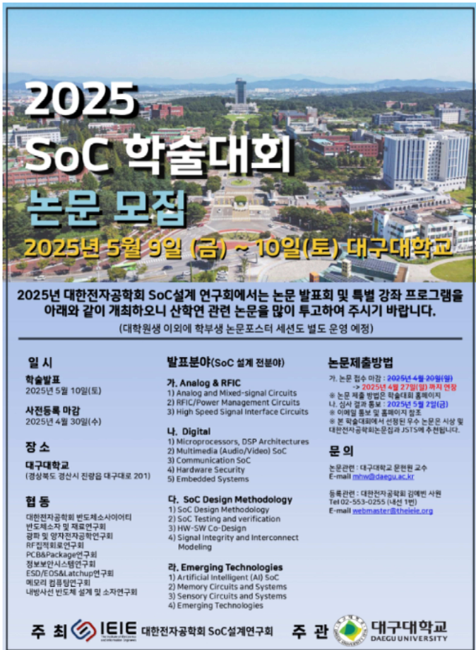 본문 시작 홈으로 학부활동 학부소개 학부활동 교육과정 커뮤니티 학부생활 입학안내 홈페이지가이드 전공 동아리 학부행사 학생회 활동 전공 동아리 학부갤러리 ICES Lab (Inteligent Computing Embedded System) DI Lab ICES Lab (Inteligent Computing Embedded System) ICES Lab (Inteligent Computing Embedded System) 페이스북 트위터 프린트 2025 SoC 학술대회 논문 발표 참가 컴퓨터학부 340 2025-06-20 2025 SoC 학술대회 논문 발표에 참가하게 된 이민준 학생입니다. 고생하셨습니다! 목록 다음 2025 SoC 학술대회 우수상 수상 만족도조사 만족도 조사 이 페이지에서 제공하는 정보에 대하여 만족하시나요? 매우만족 만족 보통 불만족 매우불만족
