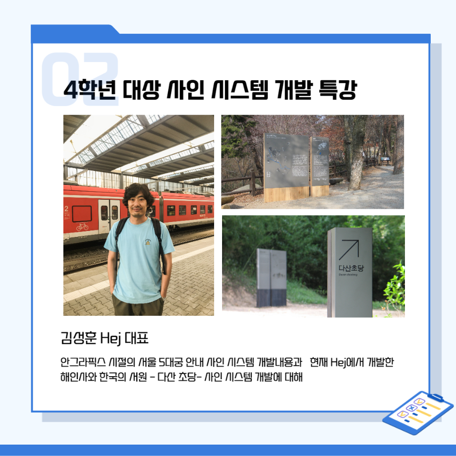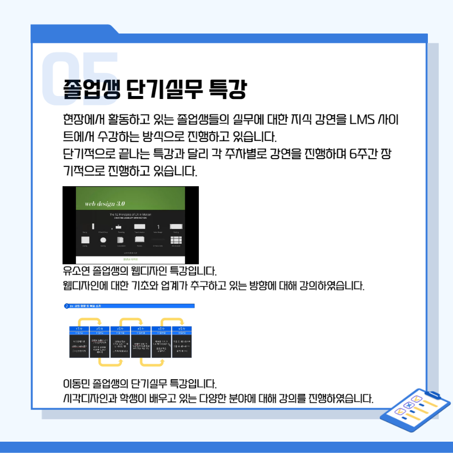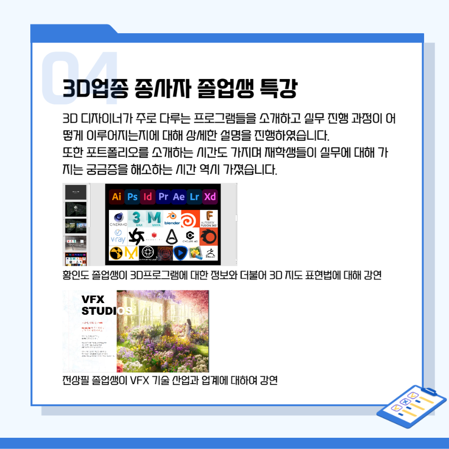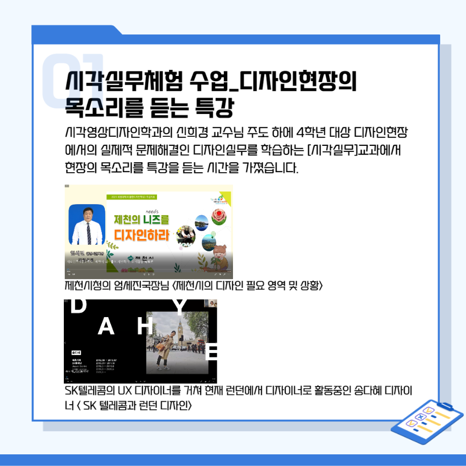 본문 시작 홈으로 시영소식 학과소개 학과과정 시영소식 입학/취업 AI 학과자랑 SNS소통 홈페이지가이드 학과행사 공지사항 학과행사 공모전 학생 인터뷰 학과행사 페이스북 트위터 프린트 시각영상디자인학과 특강 총정리! 시각영상디자인학과 2650 2022-02-07 목록 이전[대학혁신지원사업]단기실무 프로그램 다음 인문예술대학 특강 - 변화와 혁신의 시대! 열정과 디테일로 승부하라!!! 담당부서 : 시각영상디자인학과 담당자 : - 연락처 : 043-649-1726 최종수정일 : 2024-10-26 만족도조사 만족도 조사 이 페이지에서 제공하는 정보에 대하여 만족하시나요? 매우만족 만족 보통 불만족 매우불만족