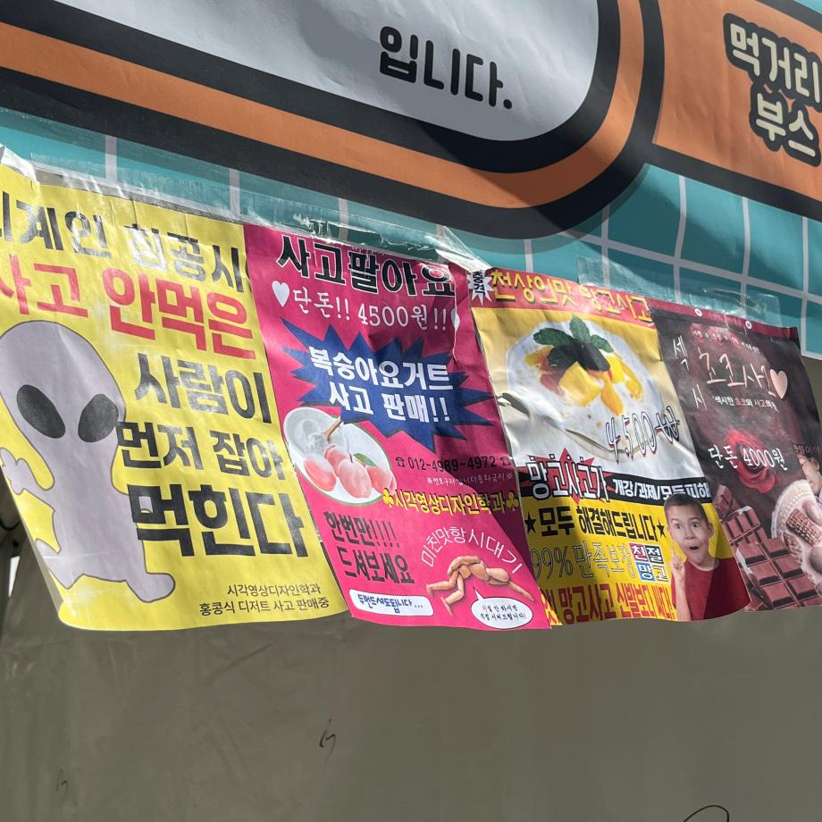 본문 시작 홈으로 시영소식 학과소개 학과과정 시영소식 입학/취업 AI 학과자랑 SNS소통 홈페이지가이드 학과행사 공지사항 학과행사 공모전 학생 인터뷰 학과행사 페이스북 트위터 프린트 2024년 청룡 축제 - 시각영상디자인학과 먹거리부스 시각영상디자인학과 1573 2024-10-01 이번 2024년 청룡축제에서 시각영상디자인학과 4학년 15명이 모여 판매한 먹거리부스는 홍콩식 과일 디저트인 <사고>입니다! 저희는 망고, 복숭아요거트,초코 이렇게 세가지 음료를 판매하였습니다. 망고, 복숭아요거트 사고는 4500원, 초코사고는 4000원에 판매하였습니다. 망고와 복숭아를 직접 생과일 손질하였으며 23일 24일 이틀합쳐서 총 300잔이 판매되었습니다! 목록 이전2024 콘텐츠스쿨 AI & 그래픽 스튜디오(그래픽) 상생하는 공공디자인 프로젝트 다음 학과 학술 특강 - 2024. 10. 8 -"현실을 준비하는 디자인 커리어 여정:실전 경험과 프로 팁" 담당부서 : 시각영상디자인학과 담당자 : - 연락처 : 043-649-1726 최종수정일 : 2024-10-26 만족도조사 만족도 조사 이 페이지에서 제공하는 정보에 대하여 만족하시나요? 매우만족 만족 보통 불만족 매우불만족