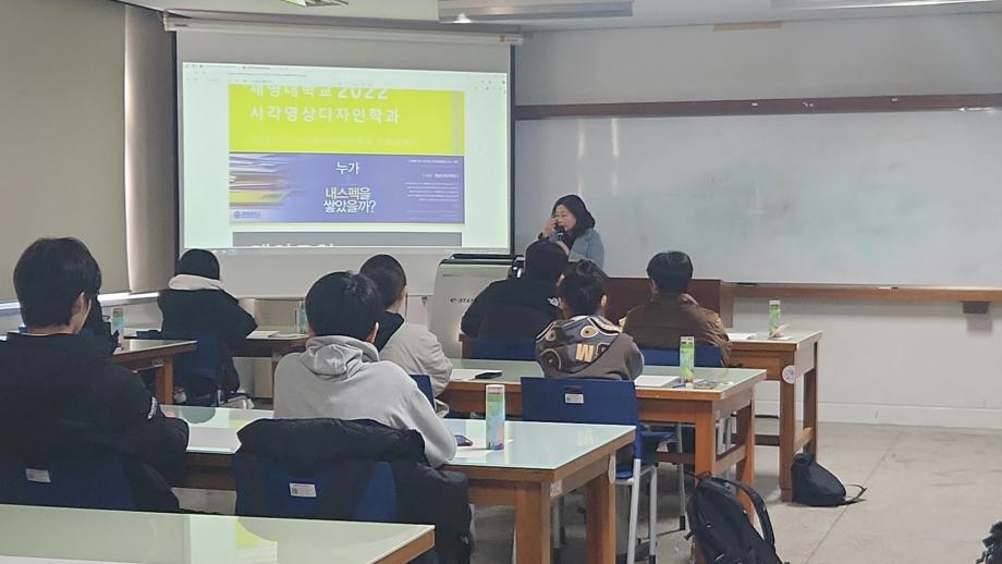 본문 시작 홈으로 시영소식 학과소개 학과과정 시영소식 입학/취업 AI 학과자랑 SNS소통 홈페이지가이드 학과행사 공지사항 학과행사 공모전 학생 인터뷰 학과행사 페이스북 트위터 프린트 세명고 전공체험(12.18.수) 시각영상디자인학과 1737 2024-12-19 세명고 전공체험(12.18.수) 2024. 12. 18.(수), 13:30 ~ 15:30 2학년 재학생 22명이 본 학과에 방문하여 '기초 시각디자인 수업 체험' 시간을 가졋습니다 목록 이전세명콘텐츠스쿨(SMCS) 가을 정기 전시회 다음 2024학년도 2학기 총장표창 수여식 담당부서 : 시각영상디자인학과 담당자 : - 연락처 : 043-649-1726 최종수정일 : 2024-10-26 만족도조사 만족도 조사 이 페이지에서 제공하는 정보에 대하여 만족하시나요? 매우만족 만족 보통 불만족 매우불만족