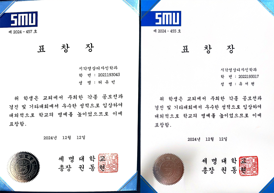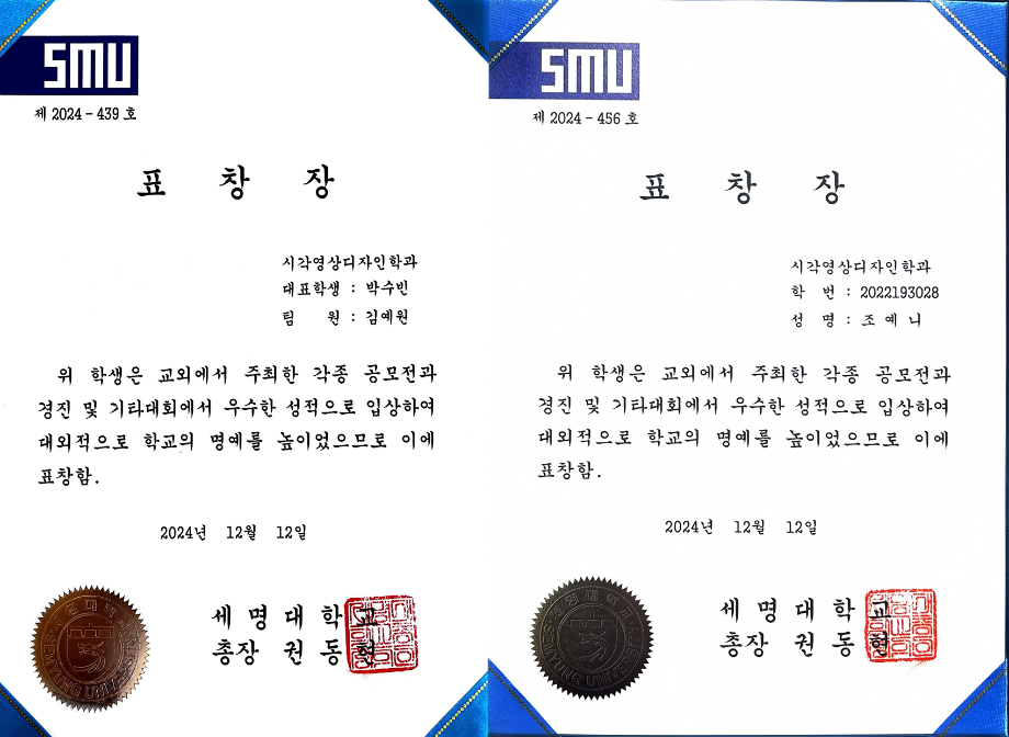 본문 시작 홈으로 시영소식 학과소개 학과과정 시영소식 입학/취업 AI 학과자랑 SNS소통 홈페이지가이드 학과행사 공지사항 학과행사 공모전 학생 인터뷰 학과행사 페이스북 트위터 프린트 2024학년도 2학기 총장표창 수여식 시각영상디자인학과 1843 2024-12-20 우리학과에서 5명이 대외수상 분야로 수상하였습니다 축하합니다~ 4학년 - 김예원, 허유빈, 박수빈 3학년 - 조예니, 유서현 목록 이전세명고 전공체험(12.18.수) 다음 AI 콘텐츠연구소 전시 안내 담당부서 : 시각영상디자인학과 담당자 : - 연락처 : 043-649-1726 최종수정일 : 2024-10-26 만족도조사 만족도 조사 이 페이지에서 제공하는 정보에 대하여 만족하시나요? 매우만족 만족 보통 불만족 매우불만족