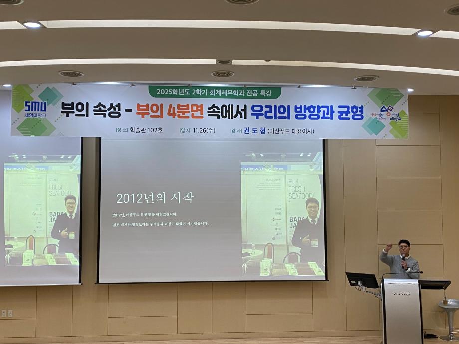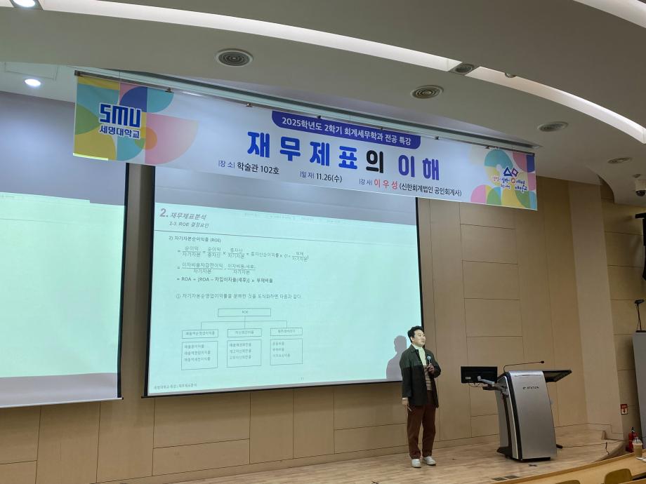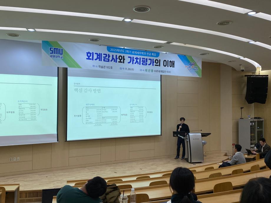 본문 시작 홈으로 학과소식 학과소개 취업정보 교육과정 학과소식 홈페이지가이드 학과행사 공지사항 포토갤러리 학과이야기 학과행사 학과행사 페이스북 트위터 프린트 2025학년도 2학기 회계세무학과 전공특강 회계세무금융학과 325 2025-11-27 2025학년도 2학기 회계세무학과 전공특강을 진행하였습니다~! 목록 이전2025학년도 2학기 회계세무학과 전문가 특강 다음 회계세무학과 종강총회 만족도조사 만족도 조사 이 페이지에서 제공하는 정보에 대하여 만족하시나요? 매우만족 만족 보통 불만족 매우불만족