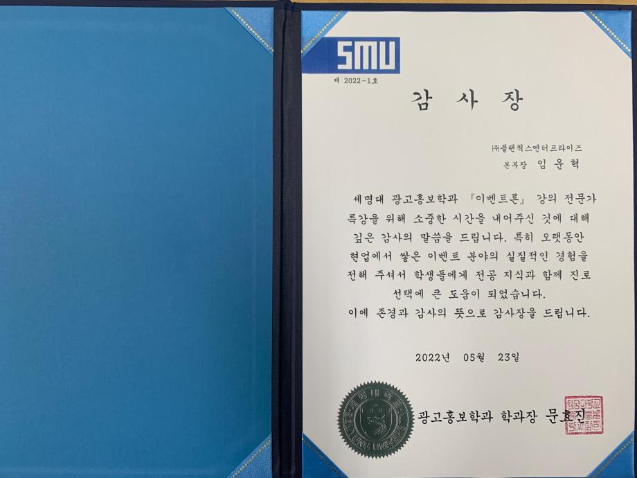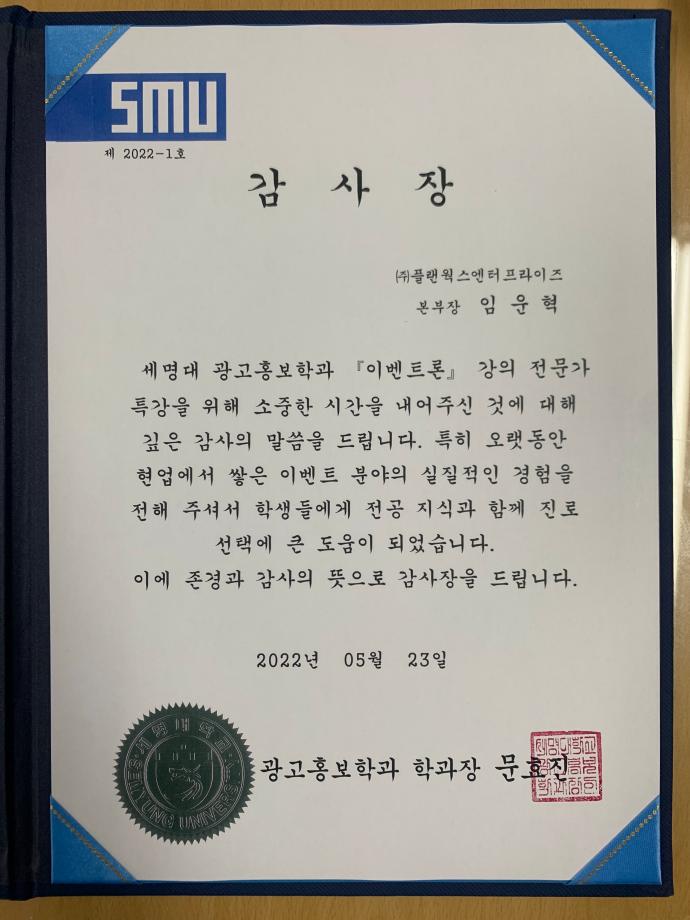 본문 시작 홈으로 매력적인 학과소개 매력적인 학과소개 흥미로운 교육과정 특별CC프로그램 We can 취업 따뜻한 커뮤니티 홈페이지가이드 지금 우리 광홍은 학과개요 학과연혁 교수소개 Wilco로 보는광고홍보학과 지금 우리 광홍은 지금 우리 광홍은 페이스북 트위터 프린트 [이벤트 제작 수업 플랜웍스엔터 임운혁 본부장님 특강] 광고홍보학과 2514 2022-05-23 5월 23일(월), 이벤트 제작 수업에 플랜웍스엔터 임운혁 본부장님의 특강이 진행되었습니다! 오랫동안 현업에서 쌓은 이벤트 실무능력과 전공 지식을 기반으로 이벤트 업계의 현황, 제안서 작성법 등을 광고홍보학과 학생들에게 가르쳐주셨습니다. 이에 존경과 감사의 뜻으로 감사패를 만들어 전달하였습니다. 학생들에게 전공 지식습득과 진로 선택에 도움이 되어주신 임운혁 본부장님께 감사인사 드립니다👍👏 목록 이전[🎊2022 광고홍보학과 광광체전🎊] 다음 [ 2022 사회과학대학 학부(과) 홍보 UCC / Short Form 공모전 수상🏆]