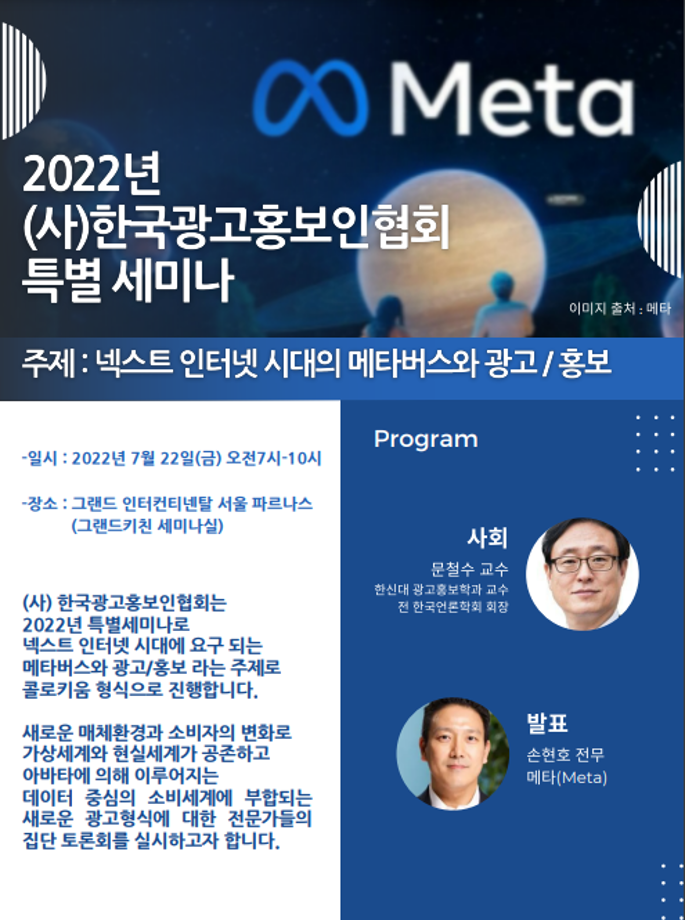 본문 시작 홈으로 매력적인 학과소개 매력적인 학과소개 흥미로운 교육과정 특별CC프로그램 We can 취업 따뜻한 커뮤니티 홈페이지가이드 지금 우리 광홍은 학과개요 학과연혁 교수소개 Wilco로 보는광고홍보학과 지금 우리 광홍은 지금 우리 광홍은 페이스북 트위터 프린트 특별 세미나_넥스트 인터넷 시대의 메타버스와광고/홍보 광고홍보학과 4480 2022-09-16 우리 광홍과 교수님들은 열공중! 특별 세미나 참석. - 주최 : (사) 한국광고홍보인협회 - 주제 : 넥스트 인터넷 시대의 메타버스와 광고/홍보 - 발표 : 손현호 전무님(Meta). Meta는 Facebook의 변경된 사명임 - 참석 : 서범석 교수님(주최자), 정연우 교수님(토론자), 문효진 교수님(토론자) * 행사를 주최한 (사)한국광고홍보인협회 회장님은 우리 광홍과 서범석 교수님이십니다. ^^ 목록 이전2022년도 광고홍보 취업 특강 시리즈 1탄 다음 대한민국 대학생 광고대회 대전/충청권 1위