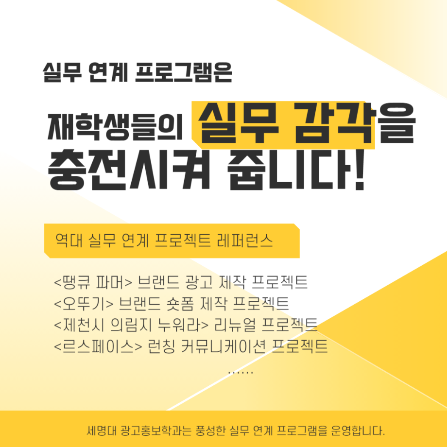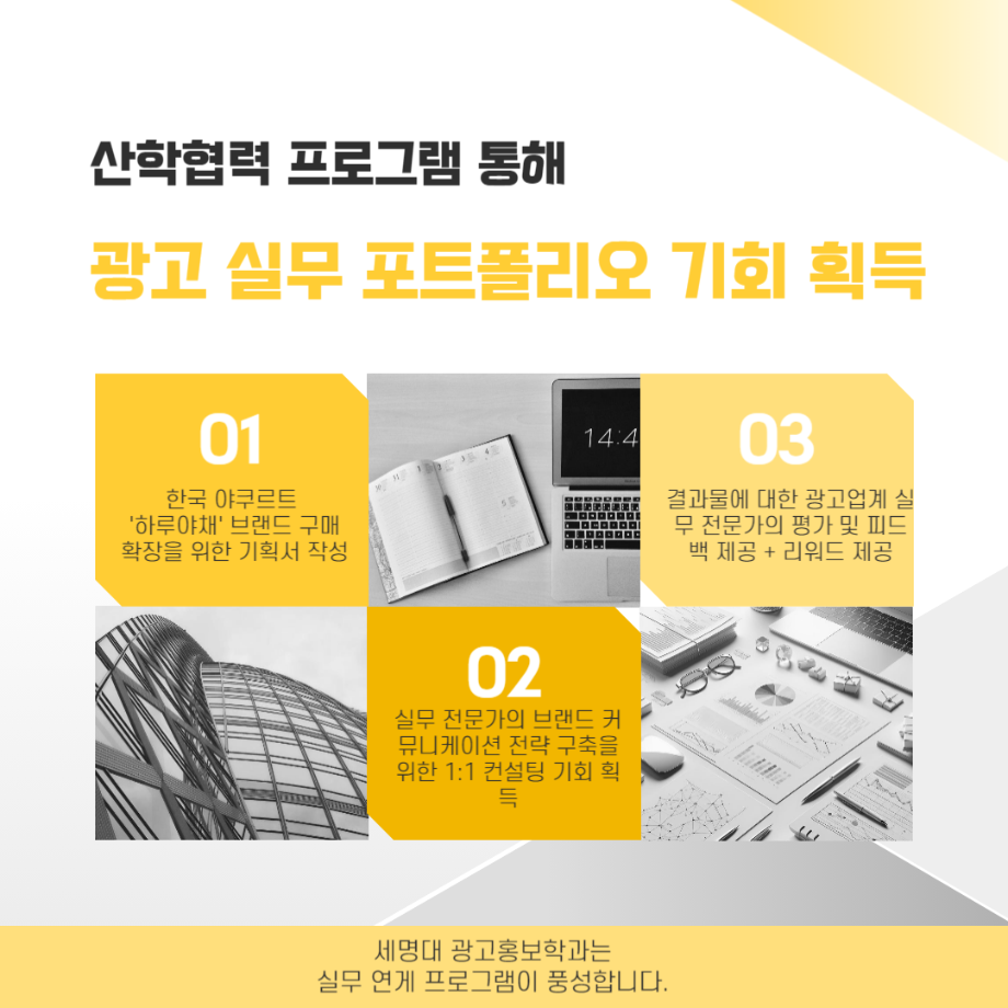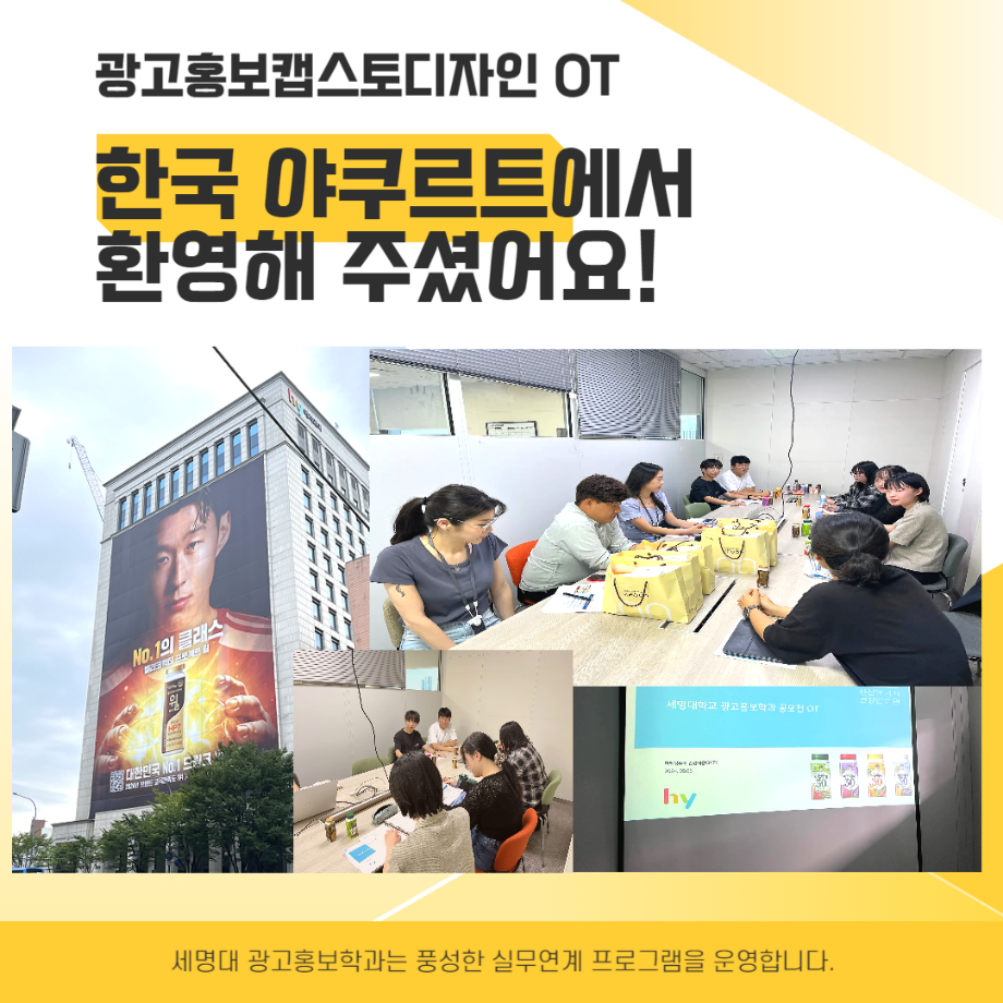 본문 시작 홈으로 매력적인 학과소개 매력적인 학과소개 흥미로운 교육과정 특별CC프로그램 We can 취업 따뜻한 커뮤니티 홈페이지가이드 지금 우리 광홍은 학과개요 학과연혁 교수소개 Wilco로 보는광고홍보학과 지금 우리 광홍은 지금 우리 광홍은 페이스북 트위터 프린트 [광고홍보캡스톤디자인]한국야쿠르트 <하루야채> 브랜드 광고홍보학과 3422 2024-09-10 2024년도 2학기 광고홍보캡스톤디자인 수업 _주 제 : 한국야쿠르트 <하루야채> 브랜드 구매 확장 전략 _담당교수 : 김신엽 교수님 _일 정 : 2024년도 2학기 성공적인 결과물을 기대합니다. : ) 세명대 광고홍보학과는 기획 맛집을 지향합니다~. 목록 이전[공동교육과정]단양/제천 소재 고교생 대상 광고/마케팅 특강 다음 [수상]2024코삭챌린저상