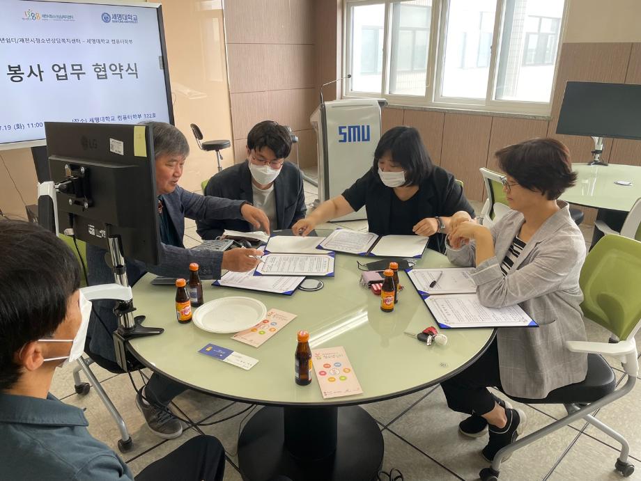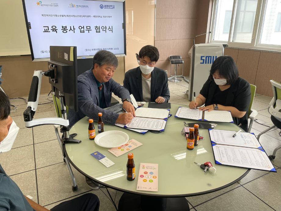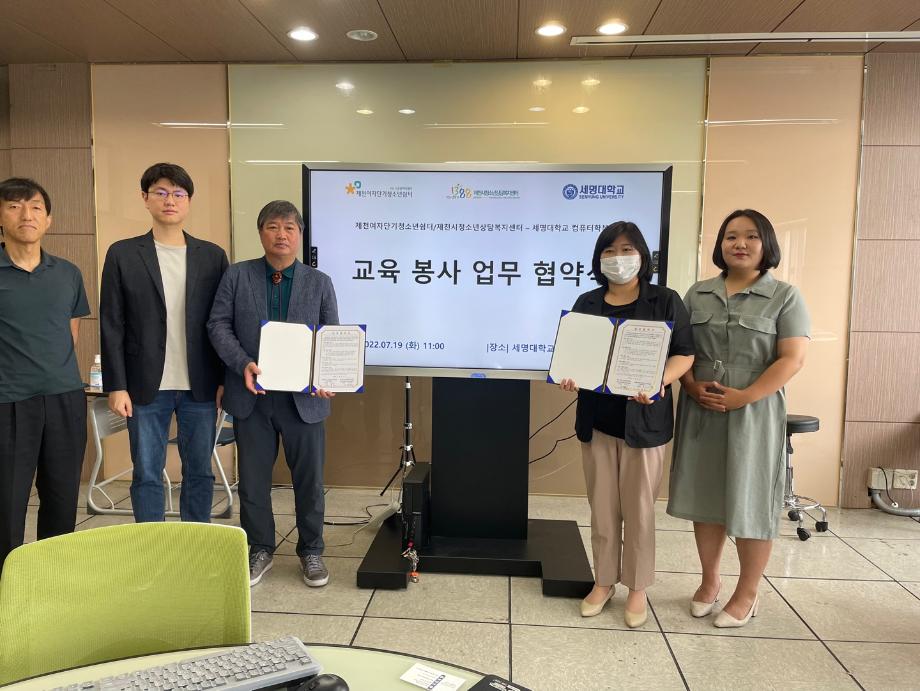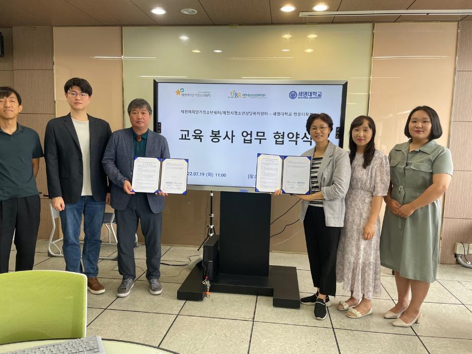 본문 시작 홈으로 학부활동 학부소개 학부활동 교육과정 커뮤니티 학부생활 입학안내 홈페이지가이드 학부행사 학부행사 학생회 활동 전공 동아리 학부갤러리 학부행사 페이스북 트위터 프린트 제천여자단기청소년쉼터/제천시청소년상담복지센터 - 세명대학교 컴퓨터학부 교육봉사 협약식 컴퓨터학부 2011 2022-07-28 우리 컴퓨터학부는 올해 제천시에 있는 제천여자단기청소년쉼터와 제천시청소년상담복지센터 이렇게 두개의 기관과 교육봉사 업무 협약을 진행하였습니다. 이번 협약은 기관 상호 간 협력체계를 구축하고 학교 밖 청소년·가정 밖 청소년 등 위기 청소년들에 대한 교육·복지 서비스를 제공해 청소년들이 진로·자기개발을 통해 건강한 삶을 영위할 수 있도록 도우려합니다. 일시: 2022년 7월 19일(화) 11:00시 장소: 첨단정보학관 322호 목록 이전2022 일반고 꿈더하기 수업량 유연화 프로젝트 다음 2022 제천미래교육지구 대학연계 진로체험 인턴십 프로그램 진행 만족도조사 만족도 조사 이 페이지에서 제공하는 정보에 대하여 만족하시나요? 매우만족 만족 보통 불만족 매우불만족