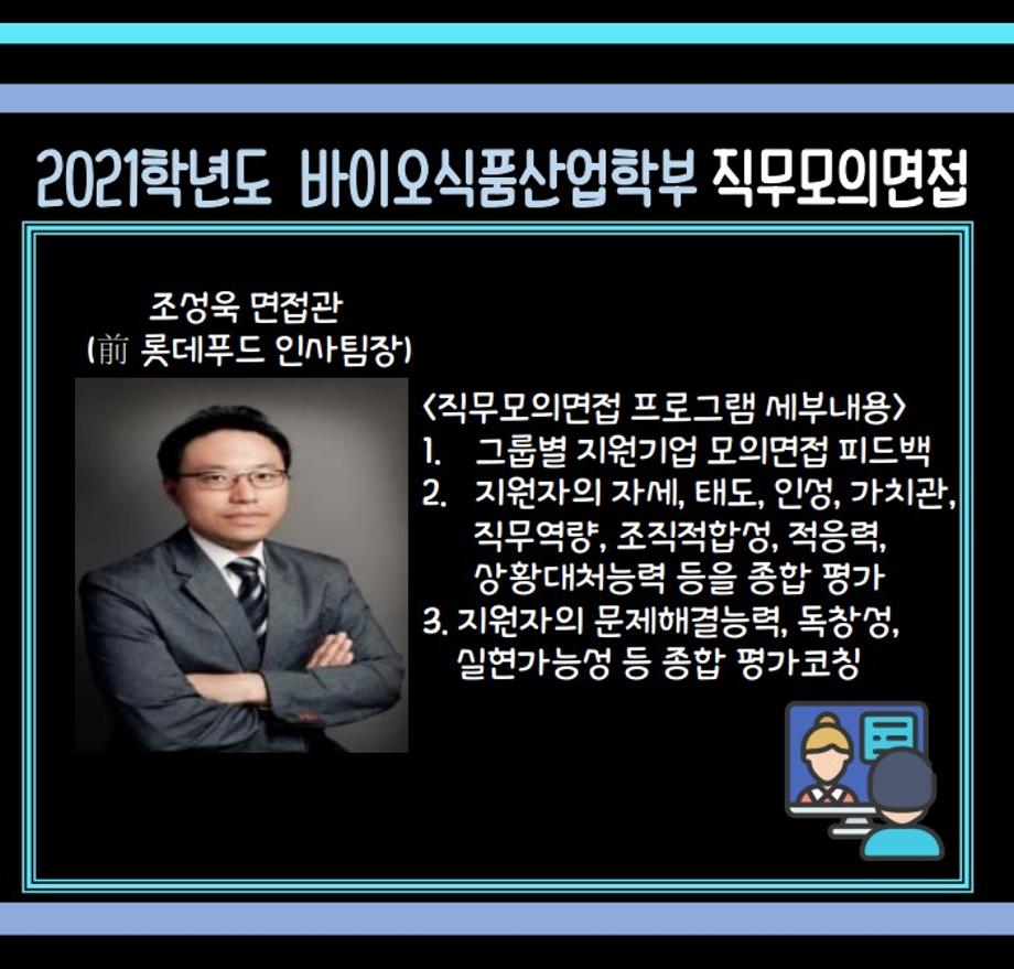 본문 시작 홈으로 학부소개 학부소개 진로·취업 교육과정 커뮤니티 대학원 입학상담 홈페이지가이드 갤러리 학부비전 학부장 인사말 학부연혁 학부장점 교수소개 교육시설 MOU 체결 갤러리 갤러리 페이스북 트위터 프린트 2021 직무모의면접 바이오식품영양학부 2381 2022-01-24 2021 직무모의면접 목록 이전2021 메디푸드개발 랜선조리경연대회 다음 2022 새내기 두드림 행사 만족도조사 만족도 조사 이 페이지에서 제공하는 정보에 대하여 만족하시나요? 매우만족 만족 보통 불만족 매우불만족