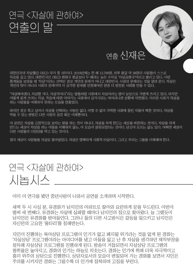 본문 시작 홈으로 학과과정 학과소개 입학정보 교수소개 학과과정 커뮤니티 공연예매 안내 홈페이지가이드 비교과프로그램 교육과정 전공교육 체계도 비교과프로그램 MOU 체결 하계, 동계 프로젝트 하계, 동계 프로젝트 연극놀이 지도사 양성 교육 현장실습 프로그램 액팅플러스 하계, 동계 프로젝트 페이스북 트위터 프린트 2021학년도 동계 프로젝트 ‘자살에 관하여’ 연기예술학과 2493 2021-03-26 목록 다음 2021학년도 동계 프로젝트 ‘넥스트 투 노멀’ 다음 2021학년도 동계 프로젝트 ‘오아시스 세탁소 습격사건’ 만족도조사 만족도 조사 이 페이지에서 제공하는 정보에 대하여 만족하시나요? 매우만족 만족 보통 불만족 매우불만족