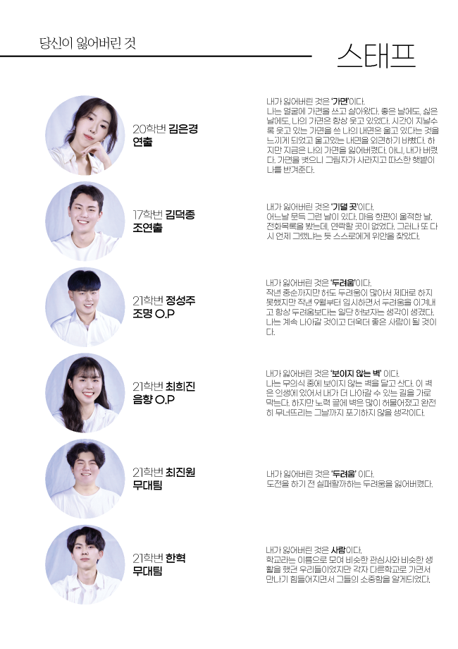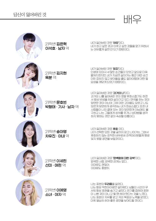 본문 시작 홈으로 학과과정 학과소개 입학정보 교수소개 학과과정 커뮤니티 공연예매 안내 홈페이지가이드 비교과프로그램 교육과정 전공교육 체계도 비교과프로그램 MOU 체결 하계, 동계 프로젝트 하계, 동계 프로젝트 연극놀이 지도사 양성 교육 현장실습 프로그램 액팅플러스 하계, 동계 프로젝트 페이스북 트위터 프린트 2021학년도 하계 프로젝트 '당신이 잃어버린 것' 연기예술학과 2533 2021-08-25 목록 이전2021학년도 하계 프로젝트 ' 쇼팔로비치 유랑극단' 이전2021 극단 포즈 창단 공연 '어정어정 걸어오신다' 만족도조사 만족도 조사 이 페이지에서 제공하는 정보에 대하여 만족하시나요? 매우만족 만족 보통 불만족 매우불만족