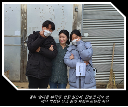 세명대 공연영상학과 16학번 조민정, 채희수 학생이 국내외 영화제에서 주목을 받은 박경목 감독의 장편영화 데뷔작 ‘엄마를 부탁해’(제작 ㈜파란오이) 촬영 현장에서 동계 현장실습을 완수했다.