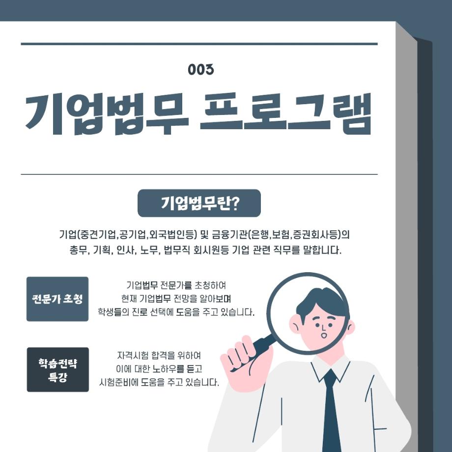 본문 시작 홈으로 학과과정 학과안내 교수소개 학과과정 커뮤니티 홈페이지가이드 비교과프로그램 교육과정 전공교육 체계도 대학원 법학과 비교과프로그램 학사일정 기업법무 지원프로그램 공공법무 지원프로그램 기업법무 지원프로그램 기업법무 지원프로그램 페이스북 트위터 프린트 비교과 프로그램 알아보기 '기업법무' 법학과 420 2025-09-04 목록 이전기업법무 지원프로그램이란??? 이전2025.05.21 항공운송법 관련 특강 담당부서 : 법학과 담당자 : - 연락처 : 043-649-1764 최종수정일 : 2024-10-26 만족도조사 만족도 조사 이 페이지에서 제공하는 정보에 대하여 만족하시나요? 매우만족 만족 보통 불만족 매우불만족
