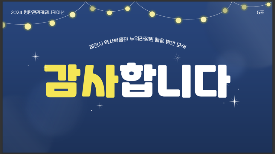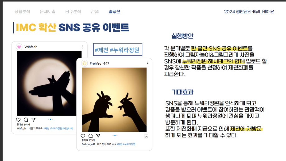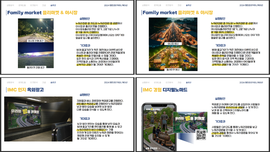 본문 시작 홈으로 흥미로운 교육과정 매력적인 학과소개 흥미로운 교육과정 특별CC프로그램 We can 취업 따뜻한 커뮤니티 홈페이지가이드 작품 갤러리 교육일정 교육과정 전공교육 체계도 졸업후진로 작품 갤러리 작품 갤러리 페이스북 트위터 프린트 [지역연계캡스톤디자인]제천의림지누워라정원발전방안기획 광고홍보학과 3566 2024-07-17 2024년 1학기 평판관리커뮤니케이션 수업 o 과제명 : 제천시 의림지 누워라 정원 발전 방안 o 프로그램 : 지역 연계 캡스톤디자인 수업 도시 브랜드 평판 관리 커뮤니케이션 전략입니다. ^^ 목록 이전[공공캠페인]서울시 공공디자인 공모전 수상작 다음 [사회과학조사방법론]키오스경험인식조사