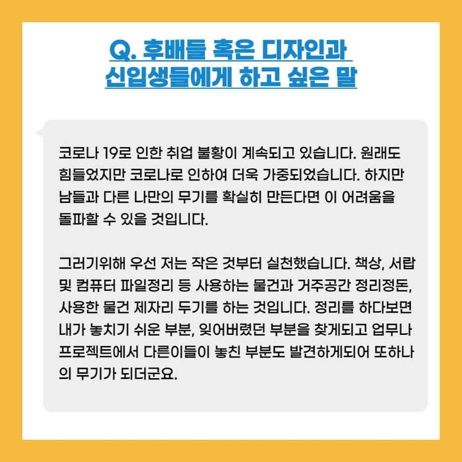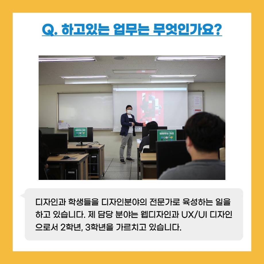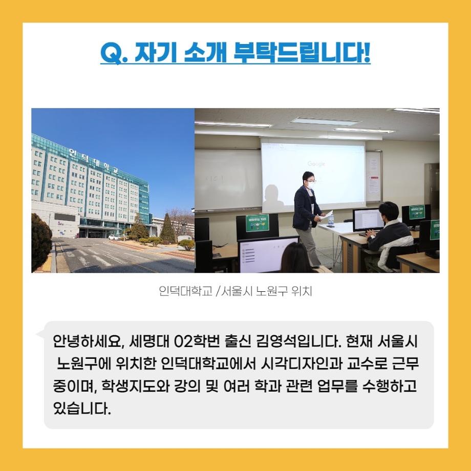 본문 시작 홈으로 입학/취업 학과소개 학과과정 시영소식 입학/취업 AI 학과자랑 SNS소통 홈페이지가이드 취업지금 입학여기 취업지금 전공소개 취업지금 페이스북 트위터 프린트 자랑스럽고 빛나는 선배들 2탄! 시각영상디자인학과 2554 2022-02-07 목록 이전자랑스럽고 빛나는 선배들 1탄! 다음 시디과 졸업 후 어디로 나아갈까? 3 담당부서 : 시각영상디자인학과 담당자 : - 연락처 : 043-649-1726 최종수정일 : 2024-10-26 만족도조사 만족도 조사 이 페이지에서 제공하는 정보에 대하여 만족하시나요? 매우만족 만족 보통 불만족 매우불만족