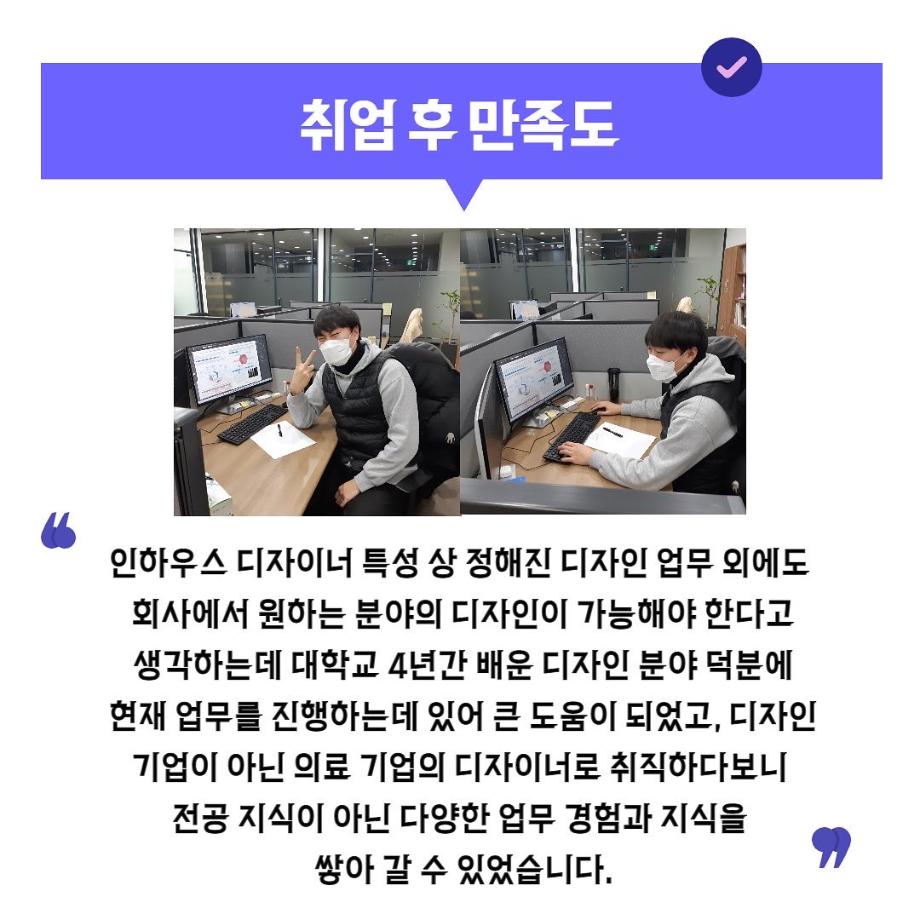본문 시작 홈으로 입학/취업 학과소개 학과과정 시영소식 입학/취업 AI 학과자랑 SNS소통 홈페이지가이드 취업지금 입학여기 취업지금 전공소개 취업지금 페이스북 트위터 프린트 시디과 졸업 후 어디로 나아갈까? 6 시각영상디자인학과 2872 2022-02-07 목록 이전시디과 졸업 후 어디로 나아갈까? 5 다음 “시각디자인학과 2002학번 반혜승 졸업생” -미국의 세계적 자산운용 회사 Fidelity Investment의 Principal User Experience Desiger 취업! 담당부서 : 시각영상디자인학과 담당자 : - 연락처 : 043-649-1726 최종수정일 : 2024-10-26 만족도조사 만족도 조사 이 페이지에서 제공하는 정보에 대하여 만족하시나요? 매우만족 만족 보통 불만족 매우불만족