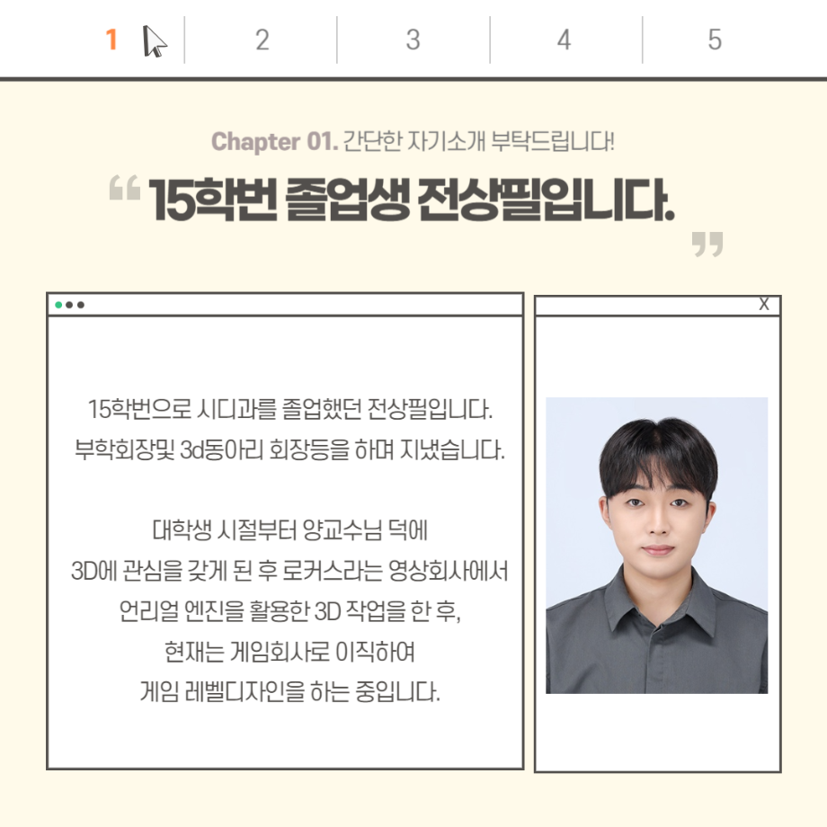 본문 시작 홈으로 입학/취업 학과소개 학과과정 시영소식 입학/취업 AI 학과자랑 SNS소통 홈페이지가이드 취업지금 입학여기 취업지금 전공소개 취업지금 페이스북 트위터 프린트 게임 레벨 디자이너 - 15학번 전상필 졸업생 시각영상디자인학과 2957 2023-07-31 목록 이전취업사례 중 대학원 진학 편 다음 행사대행사 기획자 - 17학번 김슬기 졸업생 담당부서 : 시각영상디자인학과 담당자 : - 연락처 : 043-649-1726 최종수정일 : 2024-10-26 만족도조사 만족도 조사 이 페이지에서 제공하는 정보에 대하여 만족하시나요? 매우만족 만족 보통 불만족 매우불만족