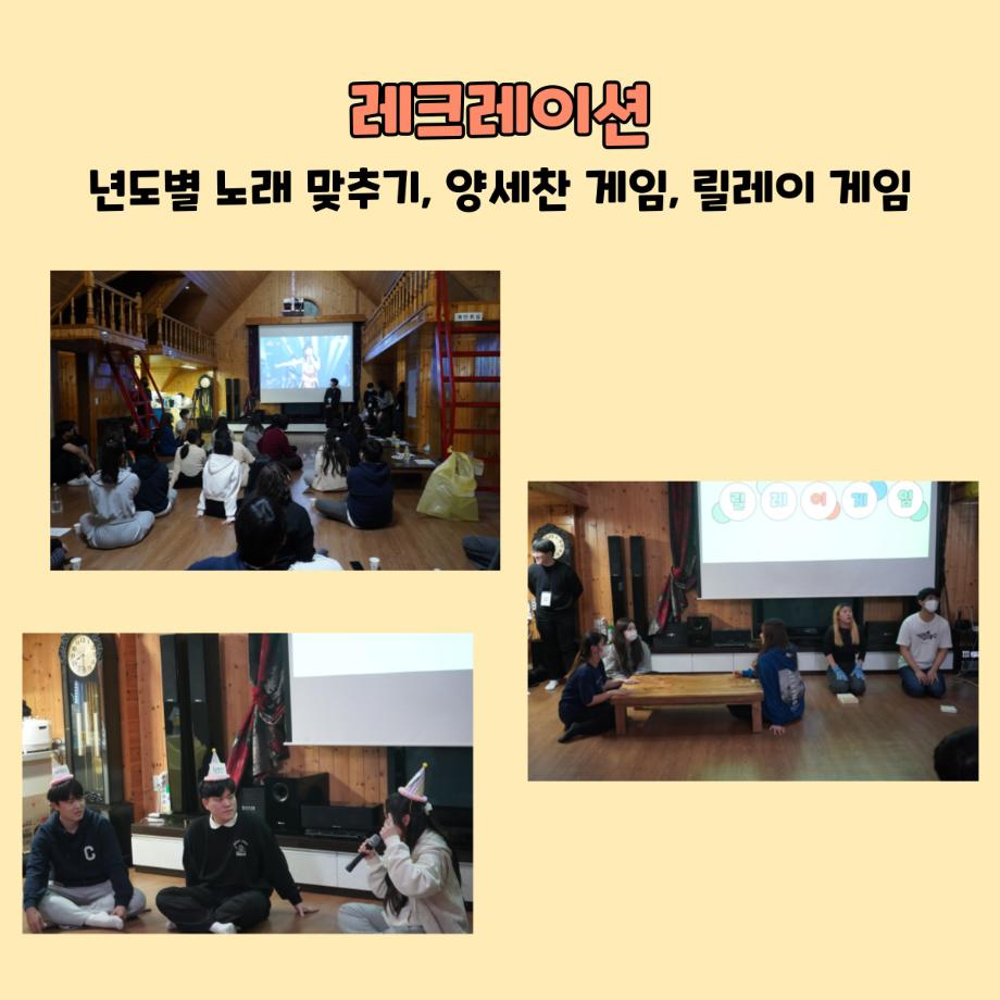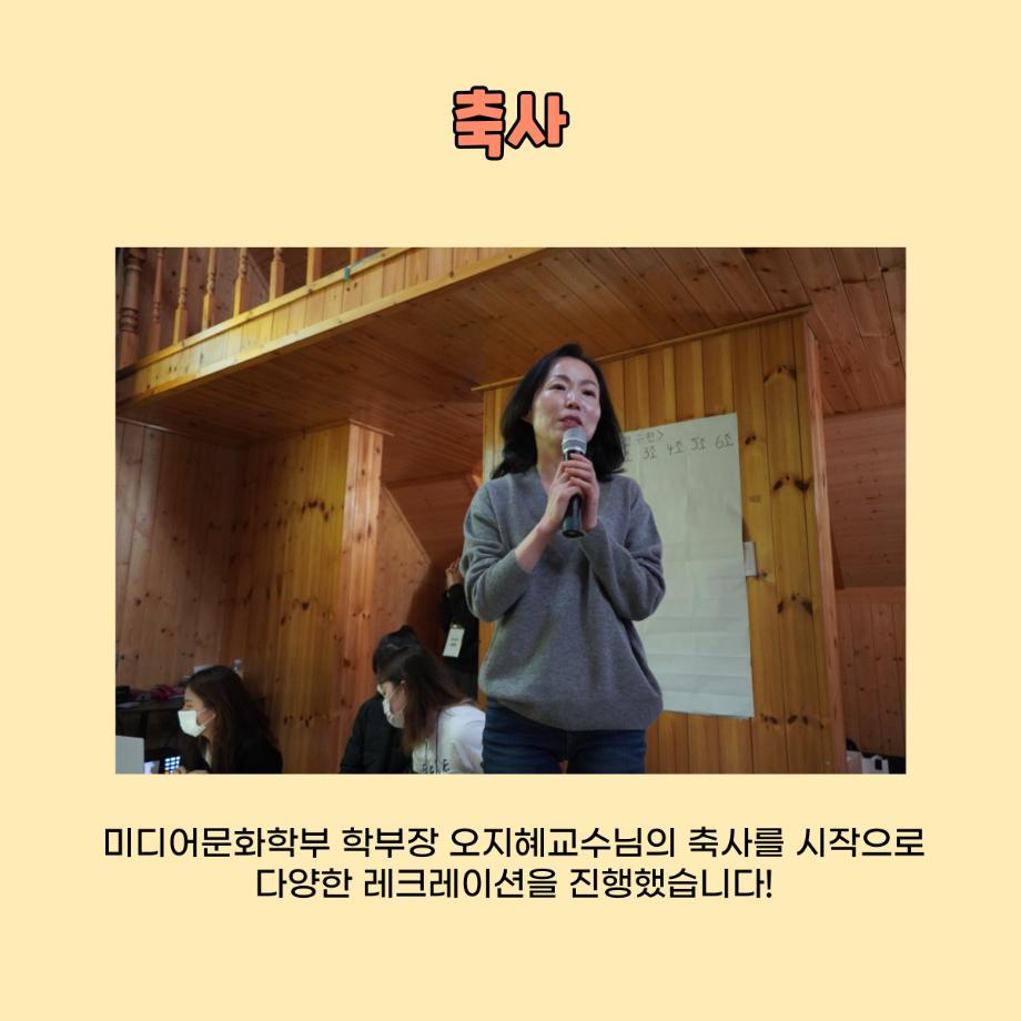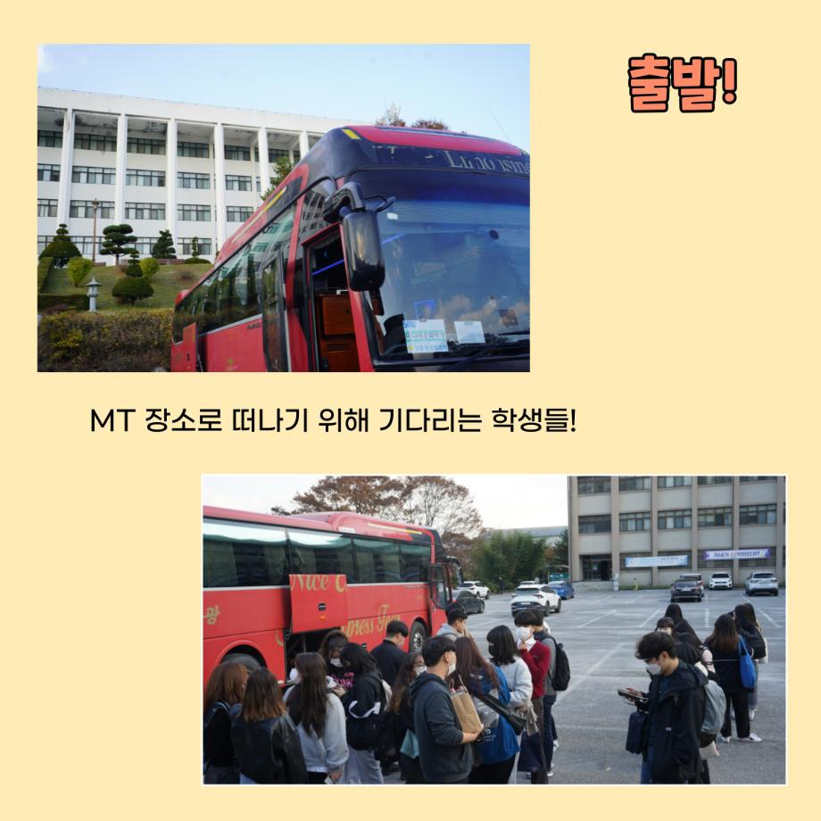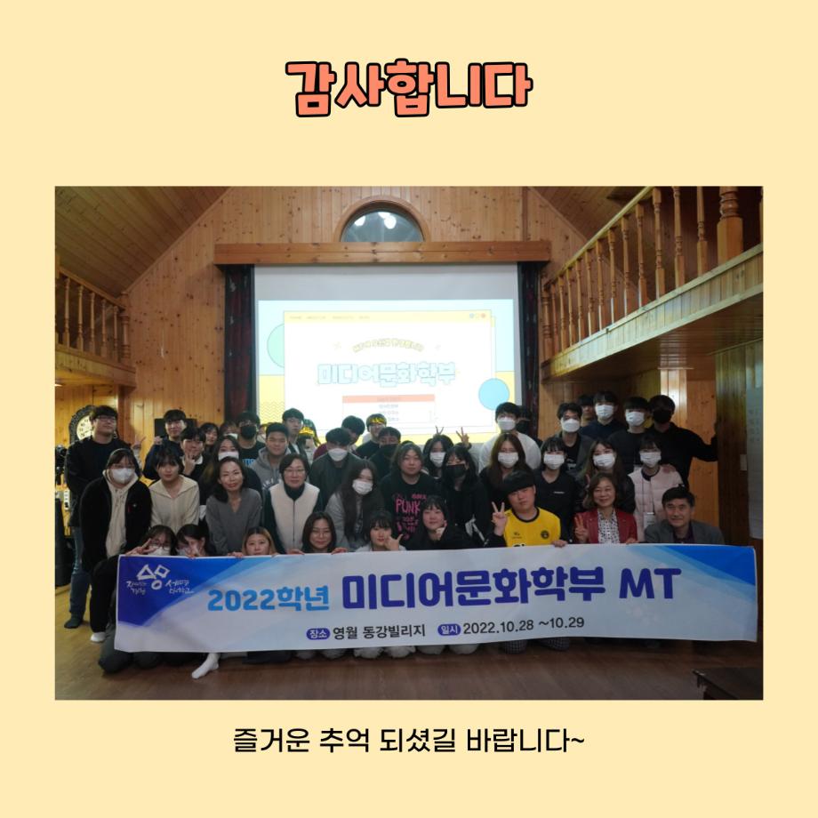 본문 시작 홈으로 학부소식 학부소개 교육과정 학부소식 커뮤니티 홈페이지가이드 미문한컷 공지사항 학사일정 학부행사 미문뉴스 미문한컷 포토갤러리 미문한컷 페이스북 트위터 프린트 미문 한 컷 | 열여섯 번째 이야기 미디어문화학부 1776 2022-11-17 미디어문화학부가 코로나19이후 3년 만에 영월 동강 빌리지로 MT를 갔다 왔습니다😎 10월 28일 (금) 모두 떨리는 마음으로 버스를 타고 세명대학교에서 출발하여 영월에 도착 후 짐을 풀고 맛있는 저녁식사를 하고 이후 교수님의 축사를 시작으로 다양한 레크리에이션 진행하였으며 레크리에이션 이후 잘 마무리하고 10월 29일 (토) 세명대학교에 잘 도착하였습니다. 앞으로 더 재미있는 MT를 진행하기 위해 노력하겠습니다! 감사합니다. 목록 이전미문 한 컷 | 열다섯 번째 이야기 다음 미문 한 컷 | 열일곱 번째 이야기 만족도조사 만족도 조사 이 페이지에서 제공하는 정보에 대하여 만족하시나요? 매우만족 만족 보통 불만족 매우불만족