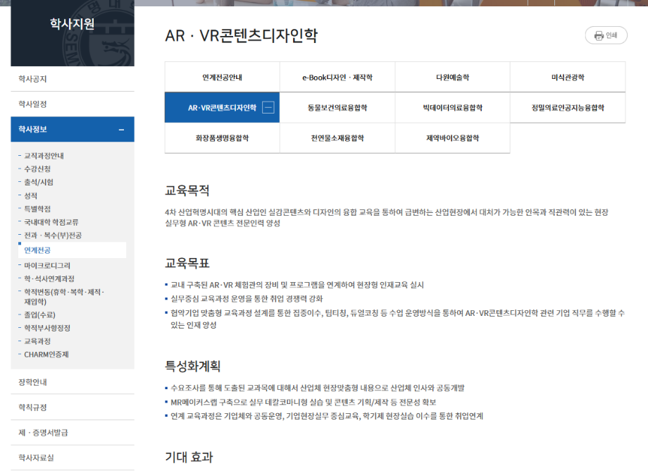 본문 시작 홈으로 학과과정 학과소개 학과과정 시영소식 입학/취업 AI 학과자랑 SNS소통 홈페이지가이드 AR·VR 연계전공 교육과정 모듈형교육과정 전공교육 체계도 AR·VR 연계전공 AR·VR 연계전공 페이스북 트위터 프린트 ARVR 연계 전공 소개 영상 시각영상디자인학과 490 2025-09-06 ARVR 연계 전공 소개 영상 https://www.semyung.ac.kr/kor/sub04_03_13_16.do 목록 이전호유당(제천약초한과)브랜드 리브랜딩- 수업과제 담당부서 : 시각영상디자인학과 담당자 : - 연락처 : 043-649-1726 최종수정일 : 2024-10-26 만족도조사 만족도 조사 이 페이지에서 제공하는 정보에 대하여 만족하시나요? 매우만족 만족 보통 불만족 매우불만족