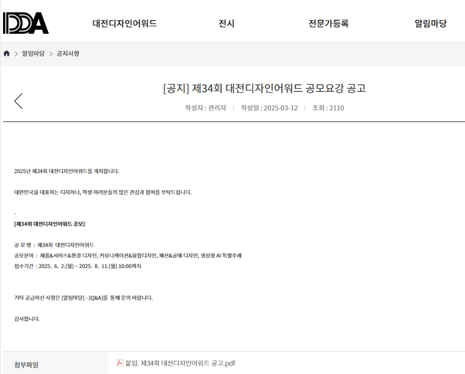본문 시작 홈으로 시영소식 학과소개 학과과정 시영소식 입학/취업 AI 학과자랑 SNS소통 홈페이지가이드 공모전 공지사항 학과행사 공모전 학생 인터뷰 공모전 페이스북 트위터 프린트 대전디자인어워드 시각영상디자인학과 891 2025-05-26 https://www.didpdda.or.kr/home/kor/main.do 목록 이전2025 한글활용디자인공모전 다음 제14회 충청북도 공공디자인공모전 담당부서 : 시각영상디자인학과 담당자 : - 연락처 : 043-649-1726 최종수정일 : 2024-10-26 만족도조사 만족도 조사 이 페이지에서 제공하는 정보에 대하여 만족하시나요? 매우만족 만족 보통 불만족 매우불만족