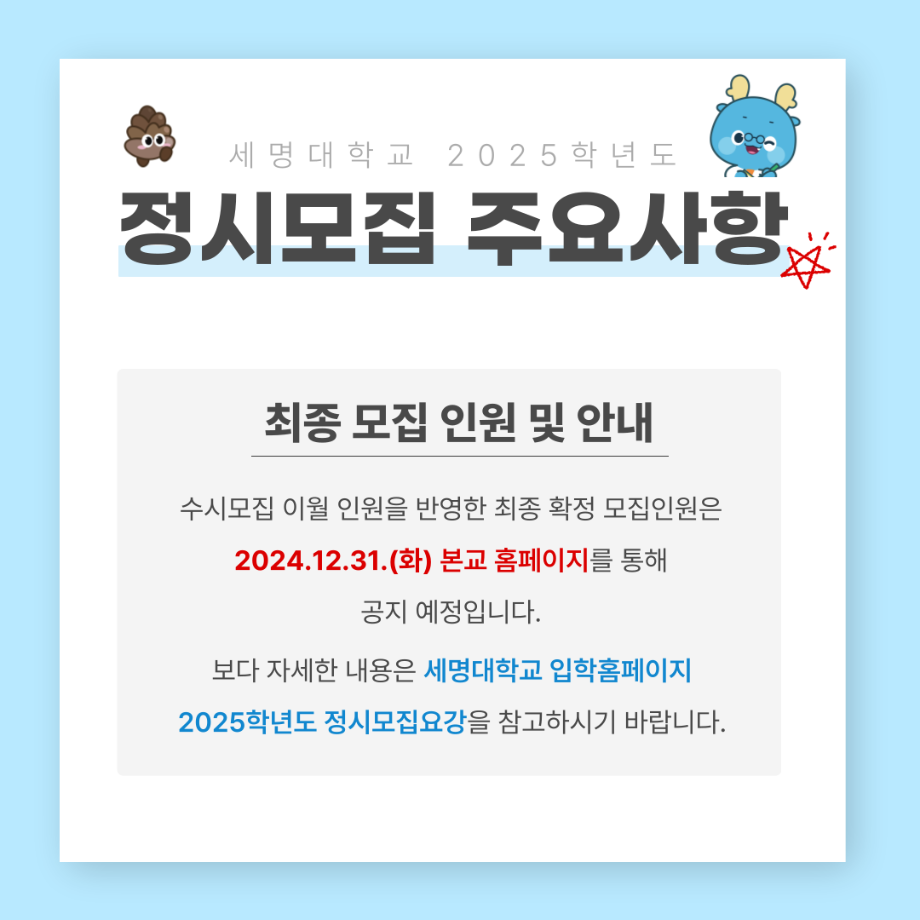 본문 시작 홈으로 커뮤니티 학과소개 교수소개 교육과정 커뮤니티 홈페이지가이드 포토갤러리 학과공지 학사일정 채용정보 및 자료 학생회 포토갤러리 포토갤러리 페이스북 트위터 프린트 세명대학교 2025학년도 정시모집 주요사항 안내 재난안전학과 2773 2024-12-30 세명대학교 2025학년도 정시모집 주요사항 안내 목록 이전세명대학교 재난안전학과 2025학년도 수시모집 충원 합격자 안내 다음 학생들의 통학은 세명대가 책임진다 만족도조사 만족도 조사 이 페이지에서 제공하는 정보에 대하여 만족하시나요? 매우만족 만족 보통 불만족 매우불만족