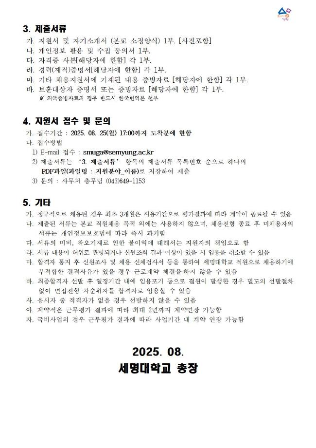 본문 시작 홈으로 커뮤니티 학과소개 교수소개 교육과정 커뮤니티 입학 정보 홈페이지가이드 취업/실습정보 학과공지 취업/실습정보 포토갤러리 취업/실습정보 페이스북 트위터 프린트 세명대학교 직원 채용 공고 [2025년 08월 25일 마감] 전기전자공학과 463 2025-08-14 목록 이전[(주)성풍건설] 채용 공고 다음 [알쓸신잡_2025년 8월 3주차] ●취업 및 일자리 정보 제공 안내문● 만족도조사 만족도 조사 이 페이지에서 제공하는 정보에 대하여 만족하시나요? 매우만족 만족 보통 불만족 매우불만족