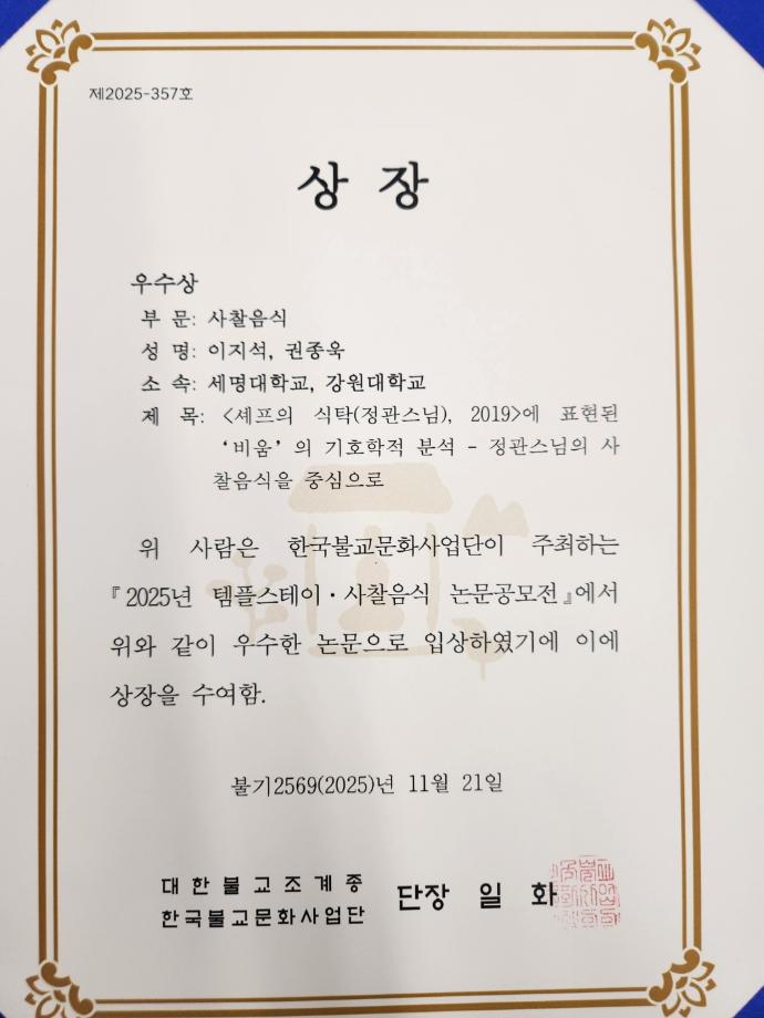 본문 시작 홈으로 커뮤니티 학과소개 교수소개 교육과정 커뮤니티 SNS 홈페이지가이드 포토갤러리 공지사항 포토갤러리 동아리 학과행사 전공관련정보 포토갤러리 페이스북 트위터 프린트 '2025년 템플스테이.사찰음식 논문공모전' 우수상 수상 반려동물산업학과 263 2025-11-25 2025년 11월 21일(금) 한국불교문화사업단이 주최하는 '2025년 템플스테이.사찰음식 논문공모전'에서 반려동물산업학과 이지석교수님께서 우수상을 수상하셨습니다. 목록 이전반려동물산업학과 강의실습실 소개 다음 학부생 2학년 KCI논문 제1저자 투고 만족도조사 만족도 조사 이 페이지에서 제공하는 정보에 대하여 만족하시나요? 매우만족 만족 보통 불만족 매우불만족