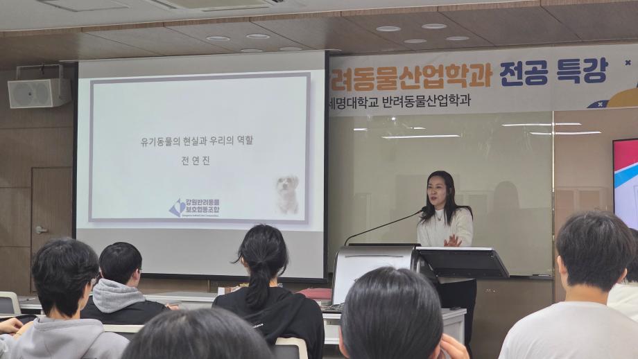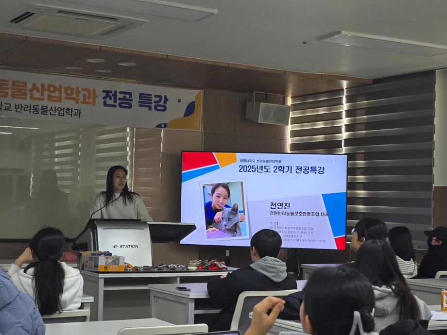 본문 시작 홈으로 커뮤니티 학과소개 교수소개 교육과정 커뮤니티 SNS 홈페이지가이드 학과행사 공지사항 포토갤러리 동아리 학과행사 전공관련정보 학과행사 페이스북 트위터 프린트 2025년도 반려동물산업학과 전공특강 반려동물산업학과 173 2025-12-26 2025년 12월 전연진 강원반려동물보호협호 협동조합 대표님께서 반려동물산업학과 전공특강을 진행해 주셨습니다. 목록 이전이지석 이주형 교수 국립중앙과학원 냥냥이 학술대회 특강 진행 다음 2026학년도 반려동물산업학과 꿈 설계학기 만족도조사 만족도 조사 이 페이지에서 제공하는 정보에 대하여 만족하시나요? 매우만족 만족 보통 불만족 매우불만족
