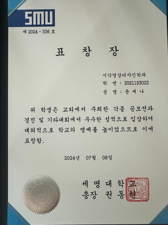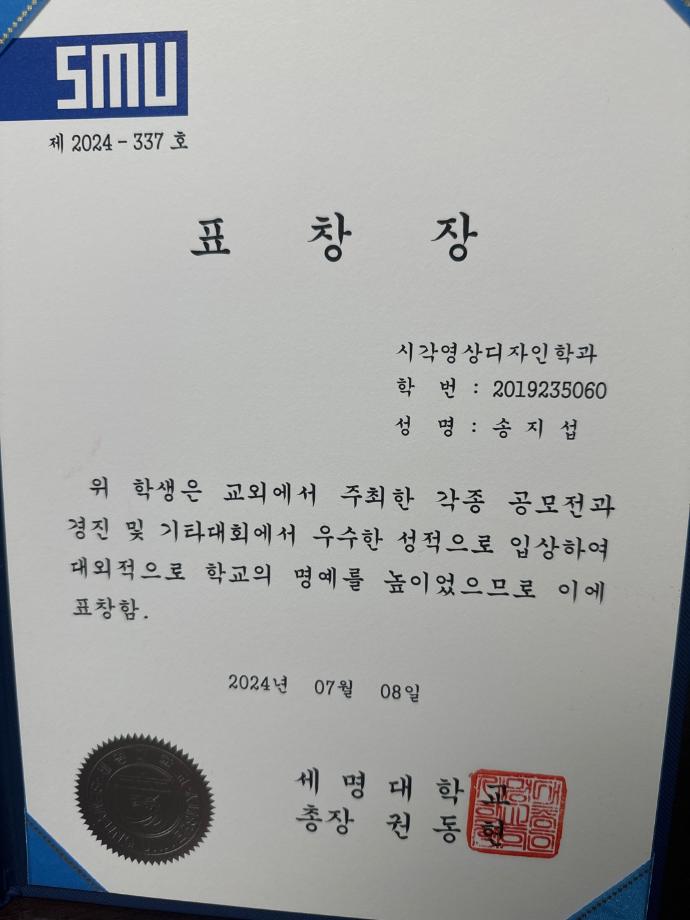 본문 시작 홈으로 학과자랑 학과소개 학과과정 시영소식 입학/취업 AI 학과자랑 SNS소통 홈페이지가이드 학과자랑 학과자랑 갤러리 공모전 동아리 졸업전시회 학과자랑 페이스북 트위터 프린트 2024학년도 1학기 총장표창 (시각영상디자인학과 3명 수상) 시각영상디자인학과 1779 2024-08-01 2024학년도 1학기 총장표창 (시각영상디자인학과 3명 수상) -학교의 명예를 빛낸 학생들에게 수여하는 총장 표창을 시각영상디자인학과에서 3명이 수상하였습니다~ (2023 국제사이버디자인트렌드공모전 대상/ 금상 수상 등) 목록 이전2024 여름 현장실습 학생 인터뷰 다음 외국인 근로자를 위한 숏폼 영상 공모전 - DO YOU KNOW 안전? 담당부서 : 시각영상디자인학과 담당자 : - 연락처 : 043-649-1726 최종수정일 : 2024-10-26 만족도조사 만족도 조사 이 페이지에서 제공하는 정보에 대하여 만족하시나요? 매우만족 만족 보통 불만족 매우불만족