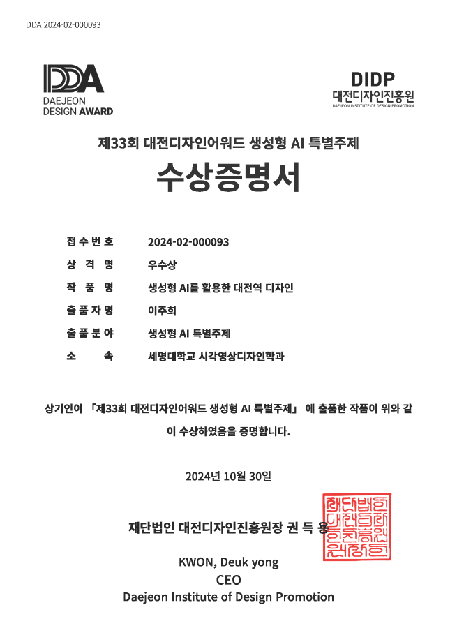 본문 시작 홈으로 학과자랑 학과소개 학과과정 시영소식 입학/취업 AI 학과자랑 SNS소통 홈페이지가이드 학과자랑 학과자랑 갤러리 공모전 동아리 졸업전시회 학과자랑 페이스북 트위터 프린트 제33회 대전디자인어워드-우수상 시각영상디자인학과 1672 2024-11-02 제33회 대전디자인어워드의 생성형 AI 특별주제부분에서 우수상(생성형 AI를 활용한 대전역 디자인-이*희학생)을 수상하였습니다 이밖에 고*호, 윤*환, 조*니학생이 특선 수상하엿습니다 목록 이전졸업생 인터뷰 - 20학번 졸업생 이*현 다음 시장 서비스러닝 / 벽화 서비스러닝 담당부서 : 시각영상디자인학과 담당자 : - 연락처 : 043-649-1726 최종수정일 : 2024-10-26 만족도조사 만족도 조사 이 페이지에서 제공하는 정보에 대하여 만족하시나요? 매우만족 만족 보통 불만족 매우불만족