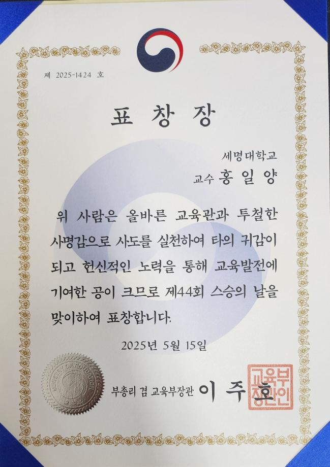 본문 시작 홈으로 학과자랑 학과소개 학과과정 시영소식 입학/취업 AI 학과자랑 SNS소통 홈페이지가이드 학과자랑 학과자랑 갤러리 공모전 동아리 졸업전시회 학과자랑 페이스북 트위터 프린트 교육부장관 표창장-홍일양교수님 시각영상디자인학과 1403 2025-06-07 홍일양 교수님께서 스승의 날을 맞이하여 교육분야에서 교육발전에 기여한 공을 인정받으시어 교육부장관 표창장을 받으셨습니다. 교수님 축하드립니다. 목록 이전2024학년도 학위수여식- 인문대(7개 학과가 속한) 전체 수석 '박*빈'학생 다음 충북과기원, 2025 충청북도 생성형 AI그림 그리기 경진대회- 신희경교수님 대상 수상 담당부서 : 시각영상디자인학과 담당자 : - 연락처 : 043-649-1726 최종수정일 : 2024-10-26 만족도조사 만족도 조사 이 페이지에서 제공하는 정보에 대하여 만족하시나요? 매우만족 만족 보통 불만족 매우불만족