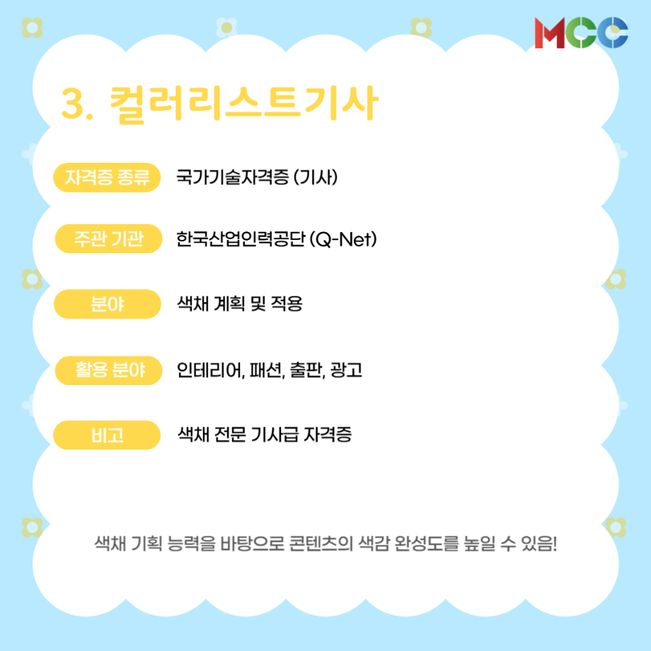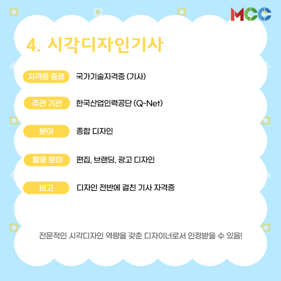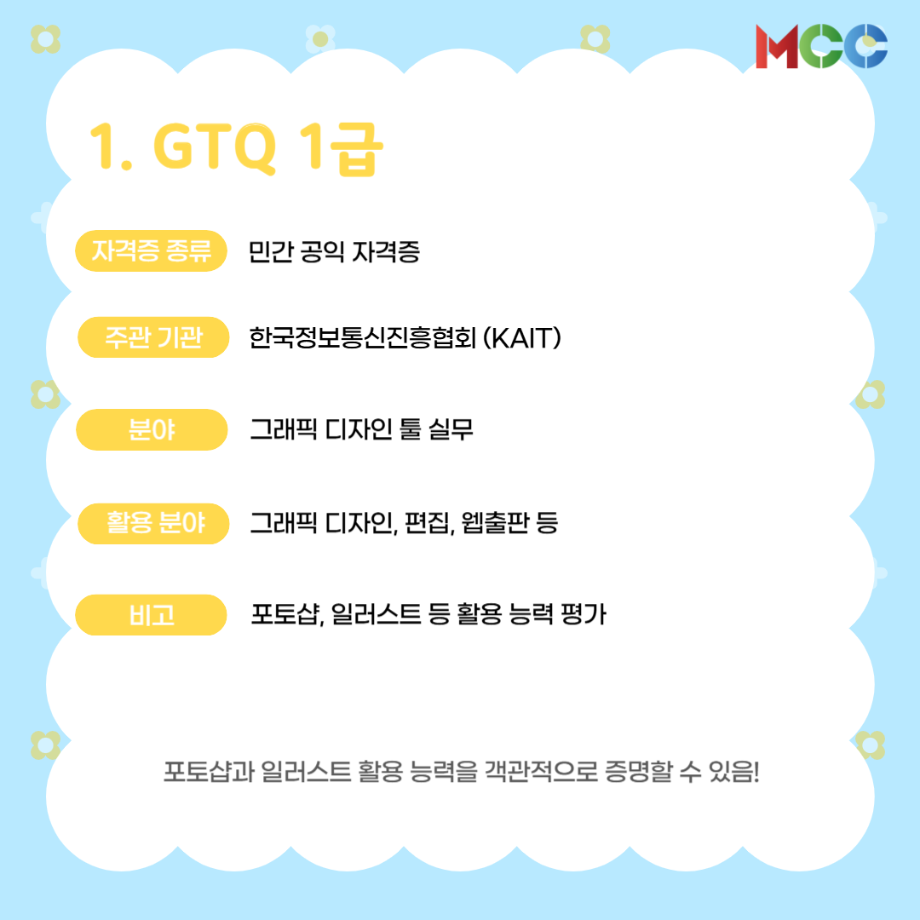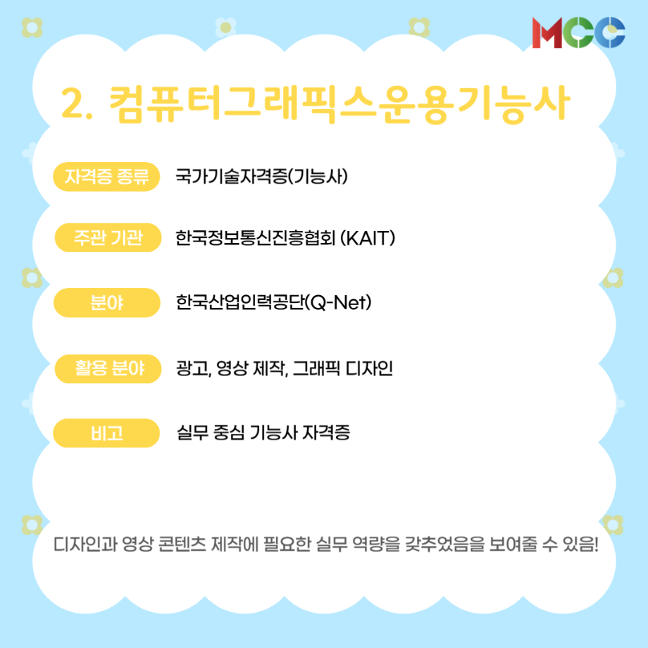 본문 시작 홈으로 MCC News 학과소개 교수소개 학과과정 MCC News MCC SNS 홈페이지가이드 미디어 정보통 학과 및 재학생 교수 및 졸업생 미디어 정보통 미디어 정보통 페이스북 트위터 프린트 미콘창 학생들을 위한 자격증 추천 리스트⭐ 미디어콘텐츠창작학과 1173 2025-06-27 방학 동안 자격증 준비를 해보는 건 어떨까요? 1. GTQ 1급 2. 컴퓨터그래픽스운용기능사 3. 컬러리스트기사 4. 시각디자인기사 5. ACA premiere pro 자세한 내용은 @smu_mcc 인스타그램에서 ! 목록 이전☀️“여름방학에 뭐 하지..?”☀️ 다음 2025 국제평화안보포럼인천 영상 콘텐츠 공모전 담당부서 : 미디어콘텐츠창작학과 담당자 : - 연락처 : 043-649-1741 최종수정일 : 2024-10-26 만족도조사 만족도 조사 이 페이지에서 제공하는 정보에 대하여 만족하시나요? 매우만족 만족 보통 불만족 매우불만족