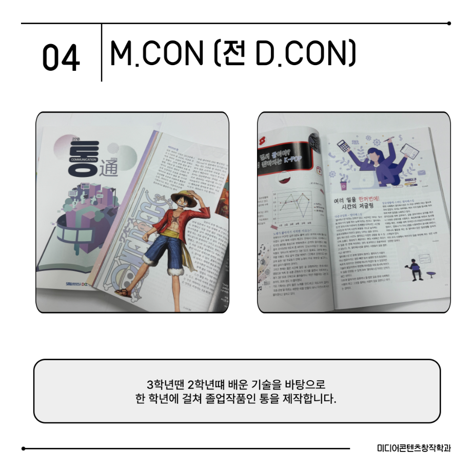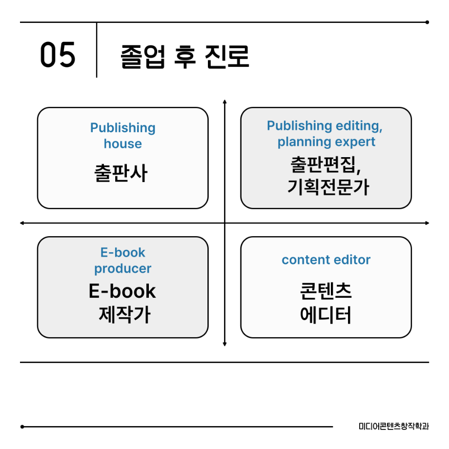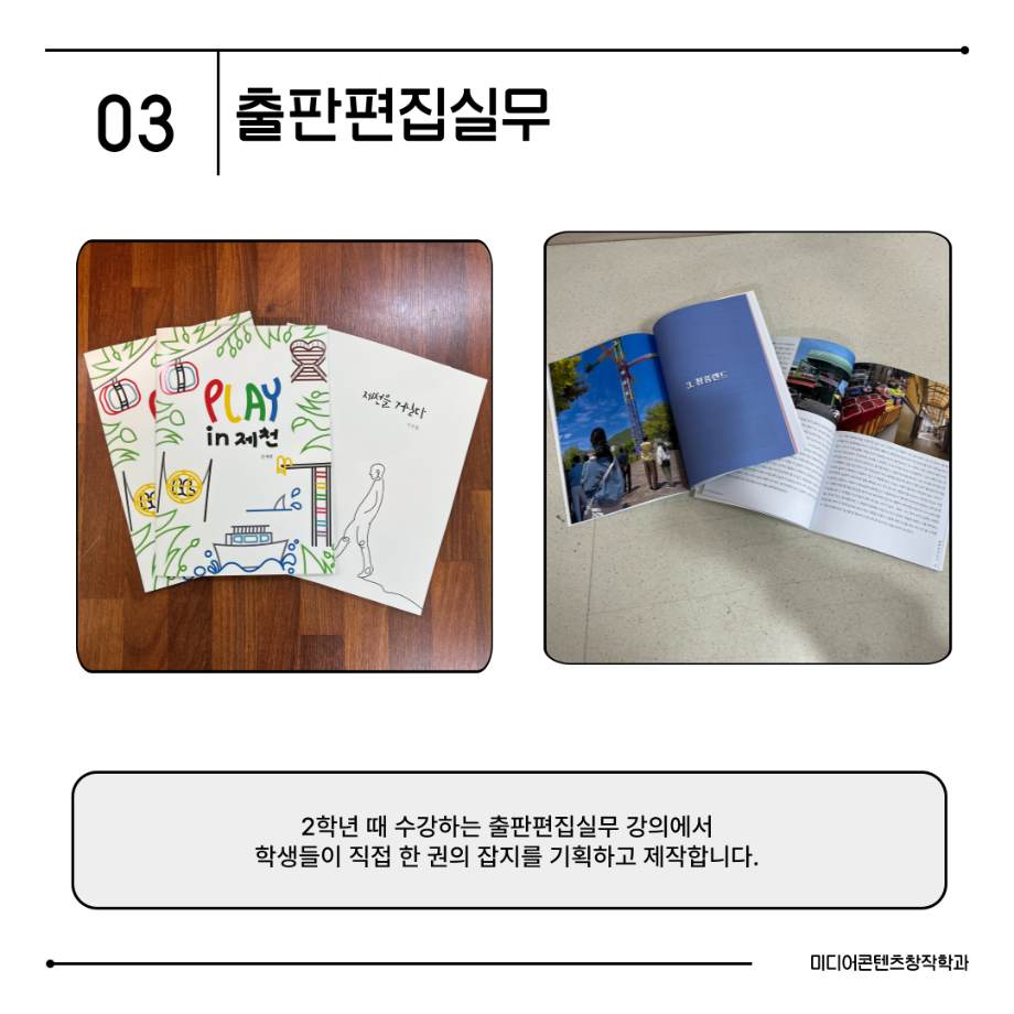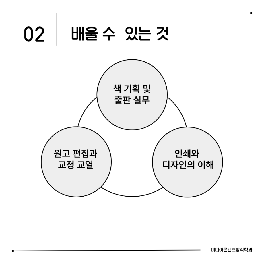 본문 시작 홈으로 MCC News 학과소개 교수소개 학과과정 MCC News MCC SNS 홈페이지가이드 미디어 정보통 학과 및 재학생 교수 및 졸업생 미디어 정보통 미디어 정보통 페이스북 트위터 프린트 📖미디어콘텐츠창작학과 | 출판 전공 미디어콘텐츠창작학과 1027 2025-08-19 출판 전공에서는 원고 편집, 기획, 디자인까지 책 제작의 모든 과정을 직접 경험합니다. 한 권의 책이 나오기까지는 수많은 손길이 필요합니다. 출판 전공은 글을 다듬고, 디자인하고, 기획하며 세상에 새로운 이야기를 전하는 과정을 배우는 곳입니다. 목록 이전경험이 실력이 되는 세명대학교 다음 📖 미디어콘텐츠창작학과 | 소설 전공 담당부서 : 미디어콘텐츠창작학과 담당자 : - 연락처 : 043-649-1741 최종수정일 : 2024-10-26 만족도조사 만족도 조사 이 페이지에서 제공하는 정보에 대하여 만족하시나요? 매우만족 만족 보통 불만족 매우불만족
