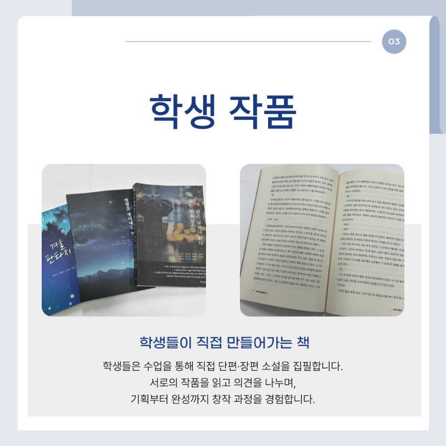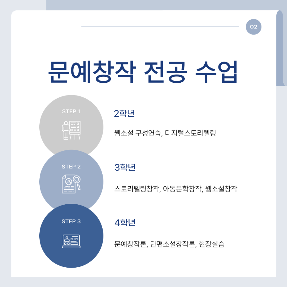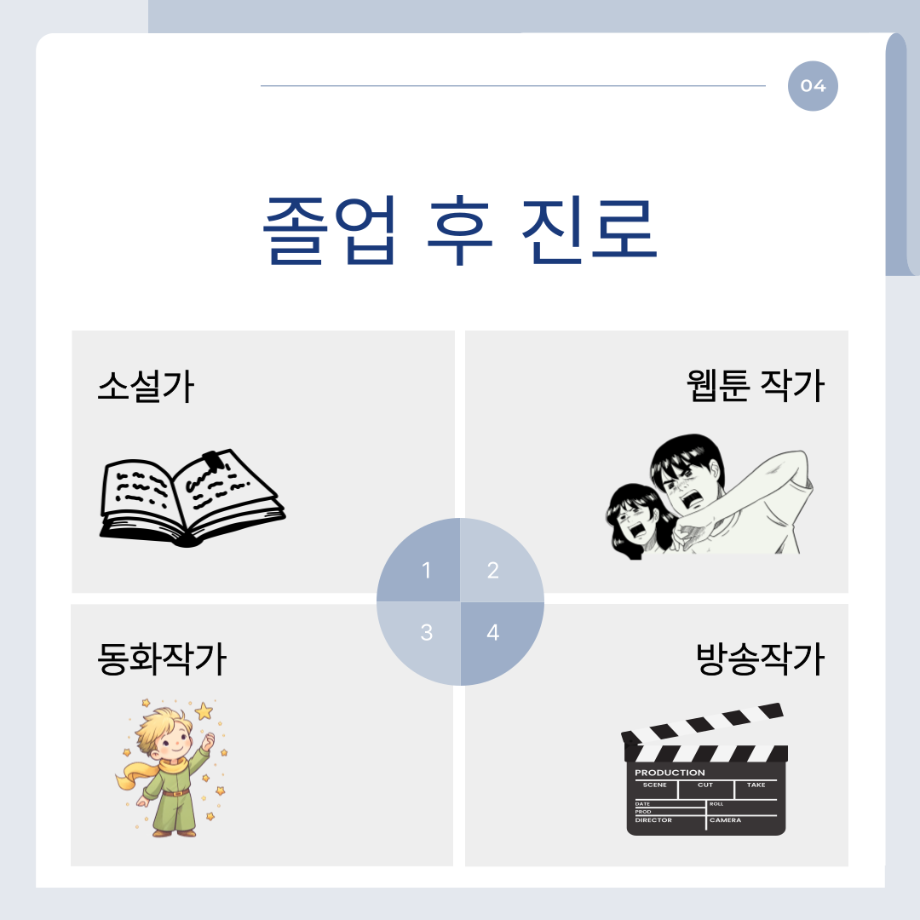 본문 시작 홈으로 MCC News 학과소개 교수소개 학과과정 MCC News MCC SNS 홈페이지가이드 미디어 정보통 학과 및 재학생 교수 및 졸업생 미디어 정보통 미디어 정보통 페이스북 트위터 프린트 📖 미디어콘텐츠창작학과 | 소설 전공 미디어콘텐츠창작학과 1145 2025-08-25 한 문장에 담긴 상상, 한 이야기로 완성되는 세계. 소설 전공에서는 기초 글쓰기부터 장르소설, 장편 창작까지 글쓰기의 전 과정을 배우며 실력을 쌓아갑니다. 작품 집필, 합평 수업, 출판 연계 활동을 통해 스토리텔링 능력과 창작 역량을 키우고, 작가·출판 기획자·콘텐츠 스토리텔러 등 다양한 진로로 나아갈 수 있습니다. 목록 이전📖미디어콘텐츠창작학과 | 출판 전공 다음 백억커피 x 곰믹스 AI 활용 영상 공모전 담당부서 : 미디어콘텐츠창작학과 담당자 : - 연락처 : 043-649-1741 최종수정일 : 2024-10-26 만족도조사 만족도 조사 이 페이지에서 제공하는 정보에 대하여 만족하시나요? 매우만족 만족 보통 불만족 매우불만족