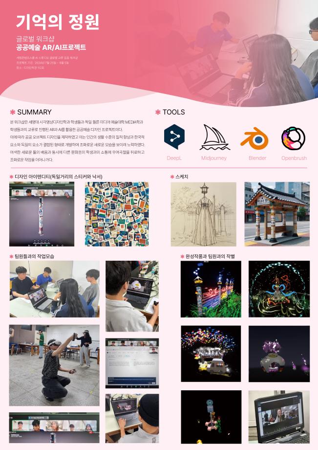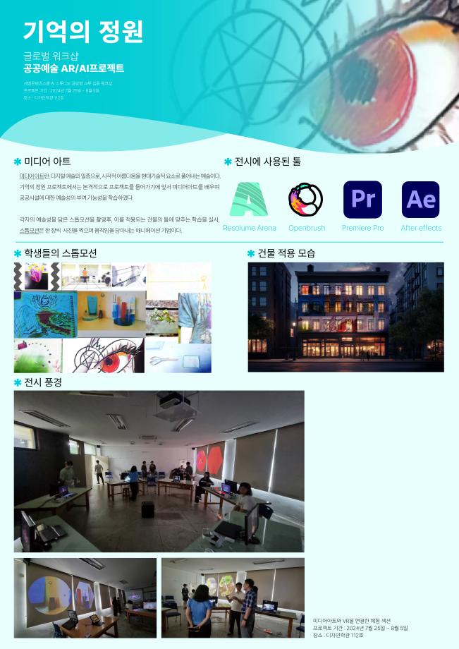 본문 시작 홈으로 AI 학과소개 학과과정 시영소식 입학/취업 AI 학과자랑 SNS소통 홈페이지가이드 AI 콘텐츠 연구소(AI 디자인) 디자인 정보 AI 콘텐츠 연구소(AI 디자인) AI 콘텐츠 연구소(AI 디자인) 페이스북 트위터 프린트 세명 AI 콘텐츠 연구소 - 세명 콘텐츠스쿨(SMCS) 가을 정기 전시회 시각영상디자인학과 800 2025-03-17 2024.12.4~12.13에 진행된 세명 콘텐츠스쿨(SMCS) 가을 정기 전시회에서 글로벌 워크샵 - 공공예술 AR/AI 프로젝트와 생성 AI 디자인 & 생성 AI 영상으로 세명 AI 콘텐츠 연구소가 참여, 전시하였습니다. 목록 이전세명 AI 콘텐츠 연구소 - 성과발표회 참여 다음 세명 AI 콘텐츠 연구소 - AI art & Design 만족도조사 만족도 조사 이 페이지에서 제공하는 정보에 대하여 만족하시나요? 매우만족 만족 보통 불만족 매우불만족