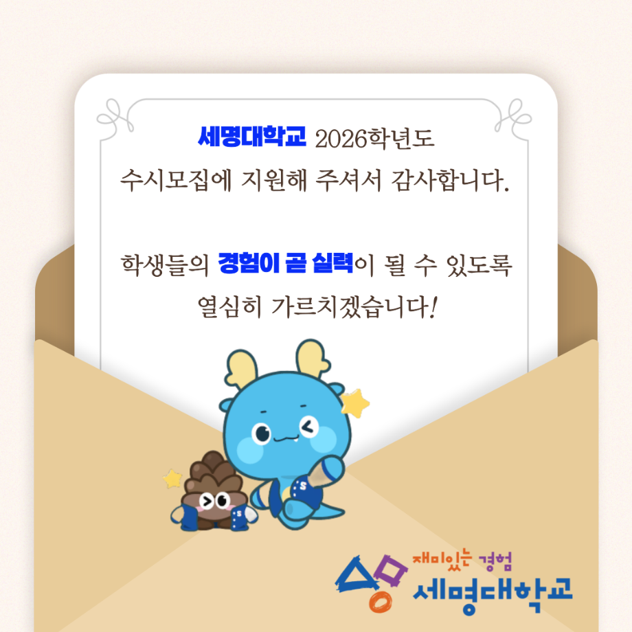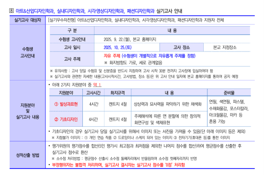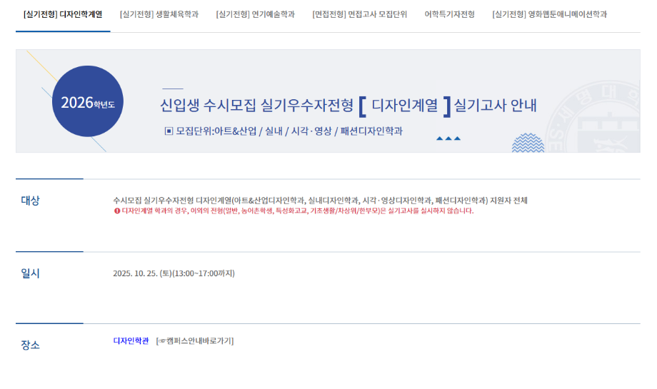 본문 시작 홈으로 입학/취업 학과소개 학과과정 시영소식 입학/취업 AI 학과자랑 SNS소통 홈페이지가이드 입학여기 입학여기 취업지금 전공소개 입학여기 페이스북 트위터 프린트 2026 수시모집 디자인계열학과 실기고사 안내 - 시각영상디자인학과 시각영상디자인학과 950 2025-10-01 2026 수시모집 디자인계열학과 실기고사 안내- 시각영상디자인학과 실기고사 안내 바로가기 > https://www.semyung.ac.kr/ipsi/sub01_07_03.do 목록 이전8월 12일 -중고등학생 대상 취업 특강- AI 브랜딩 다음 세명대학교_2026학년도 정시모집요강 만족도조사 만족도 조사 이 페이지에서 제공하는 정보에 대하여 만족하시나요? 매우만족 만족 보통 불만족 매우불만족